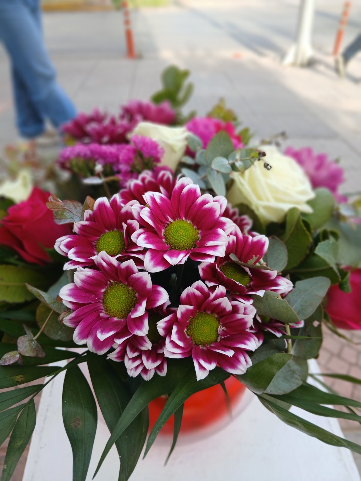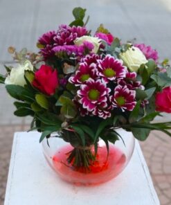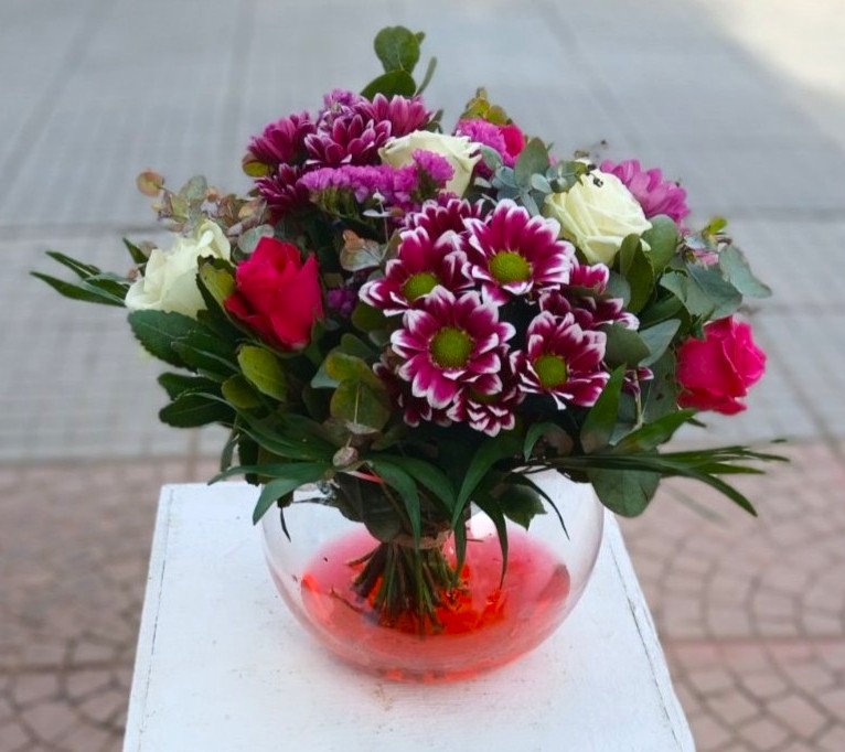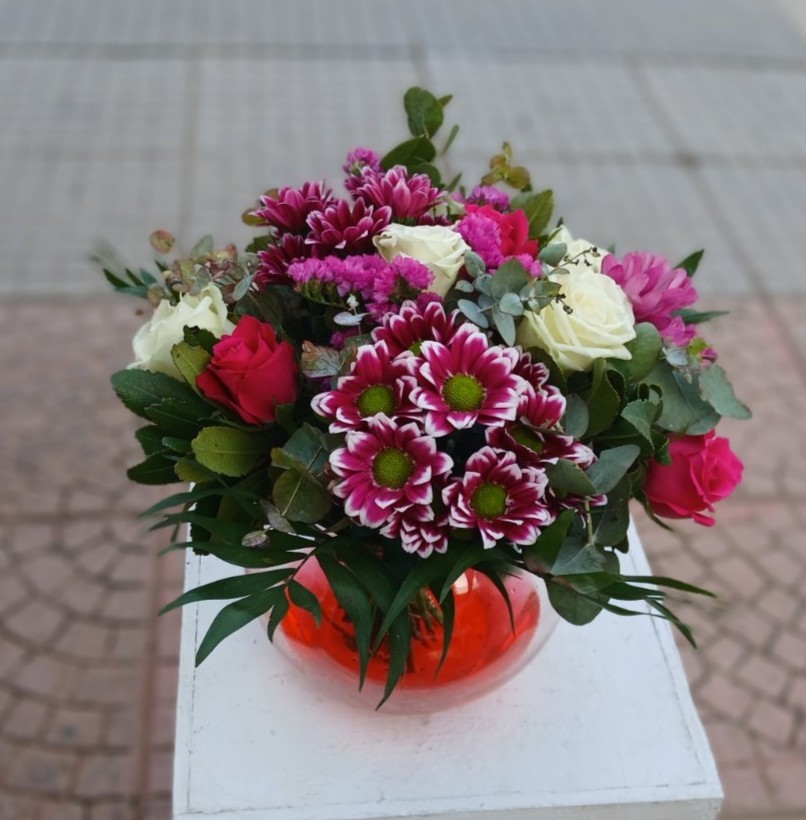 Γυαλα με πολυχρωμα λουλουδια, κοκκινα τριανταφυλλα, χρυσανθεμα διχρωμα, λευκά τριανταφυλλα & αμαραντο ροζ
