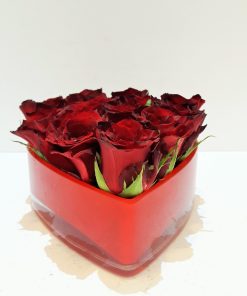 Γυάλινη κόκκινη καρδιά με τριαντάφυλλα. Μ18 Π18 Υ12 εκ.