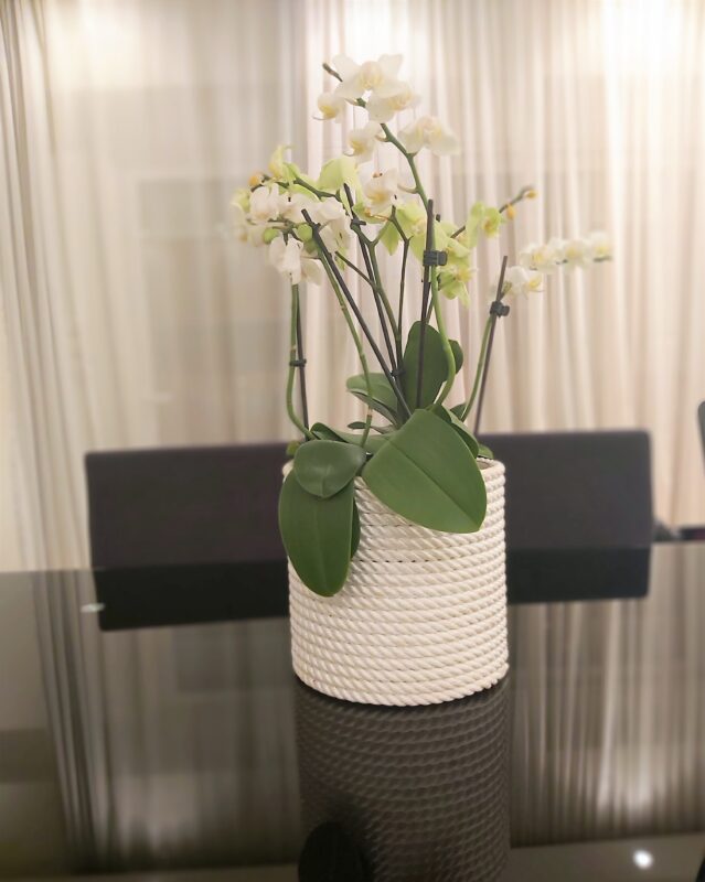 Γυάλινος κύλινδρος τυλιγμένος με ναυτικό σχοινί και μίνι ορχιδέες Υ60 Δ25