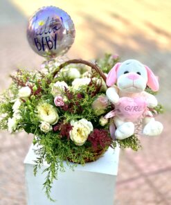 Καλάθι για γέννηση με λουλούδια εποχής, μπαλονι & αρκουδακι ροζ