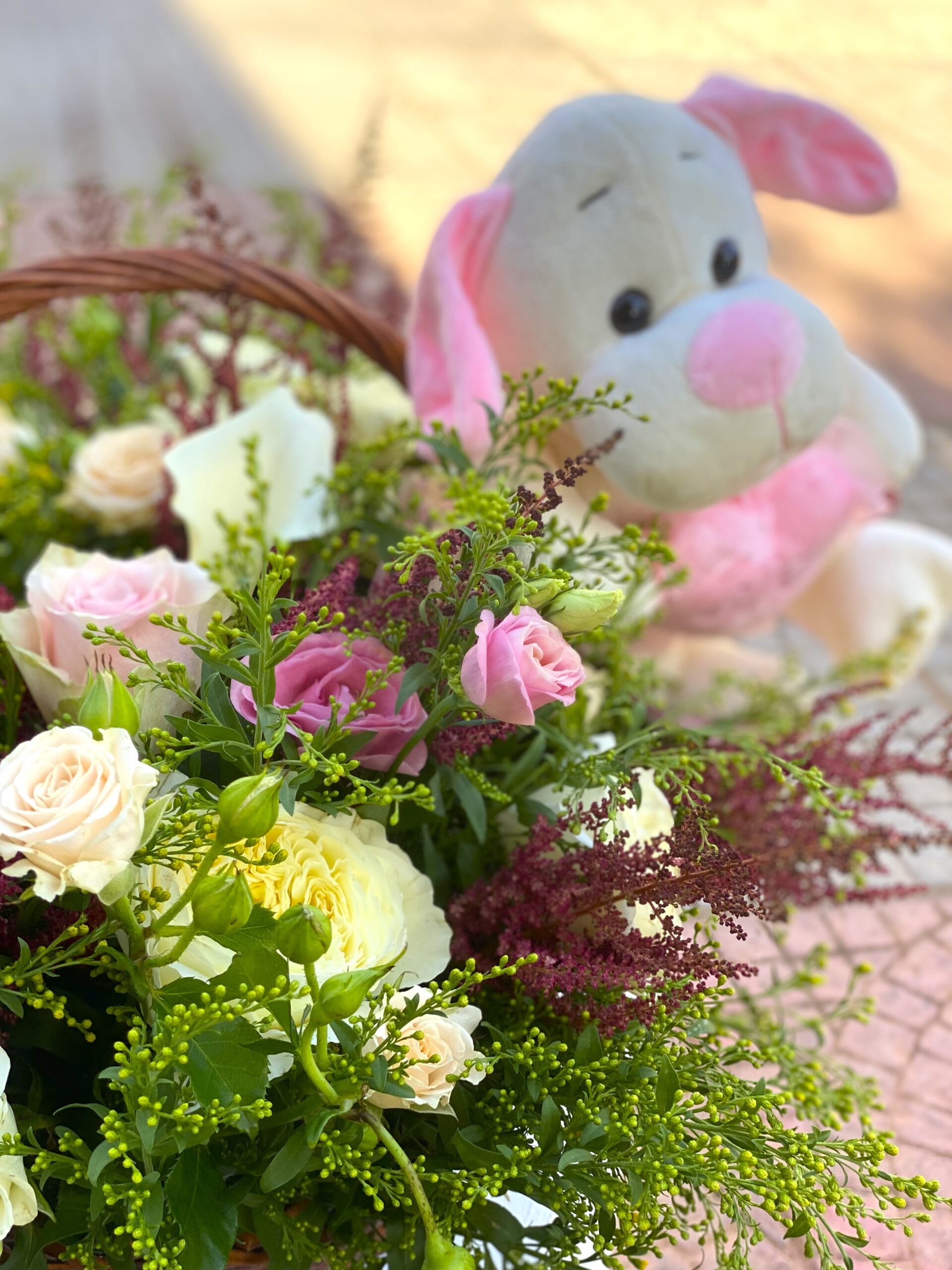 Καλάθι με λουλούδια εποχής, μπαλόνι & αρκουδάκι