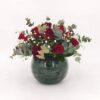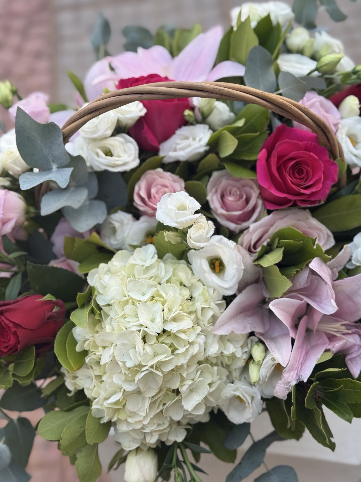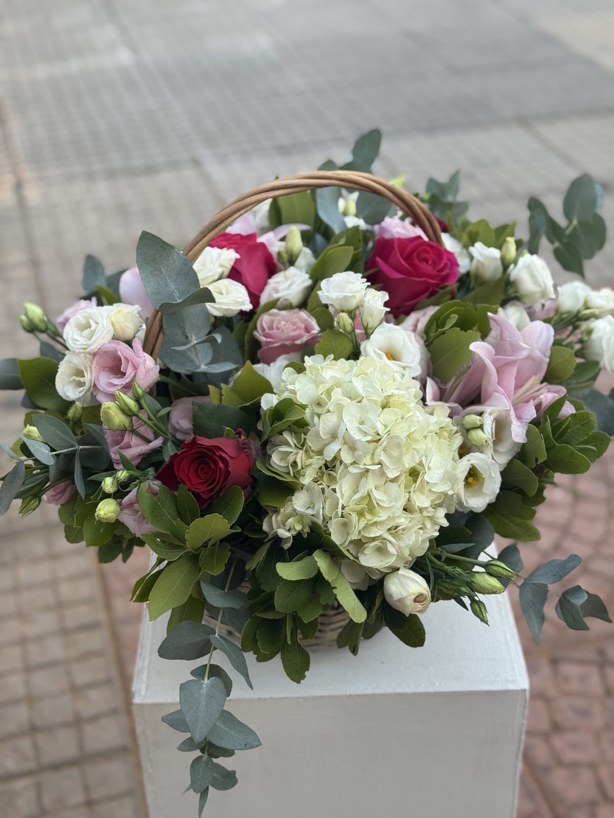 Καλάθι με συνθεση πολύχρωμη, με ορτανσιες, τριανταφυλλα, λυσιανθο & ευκάλυπτο