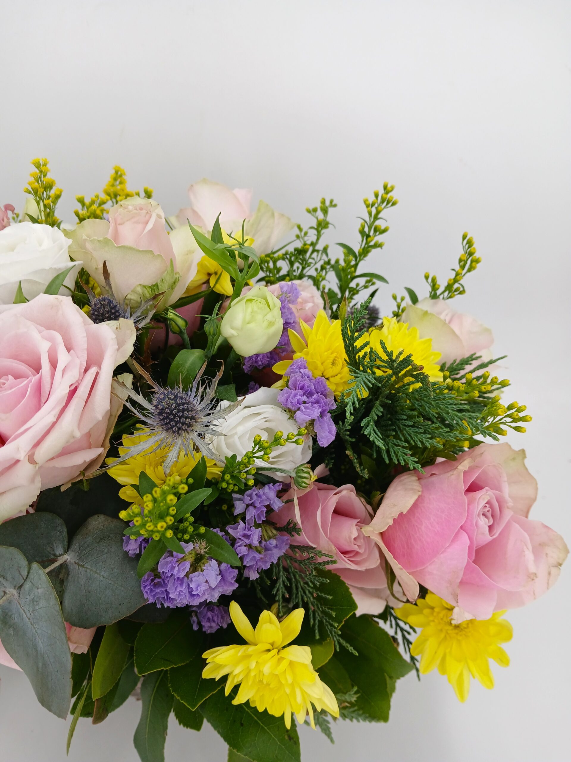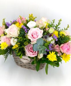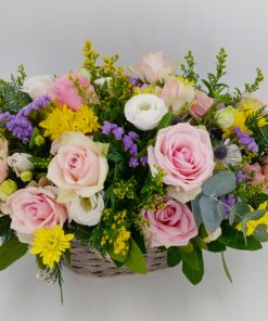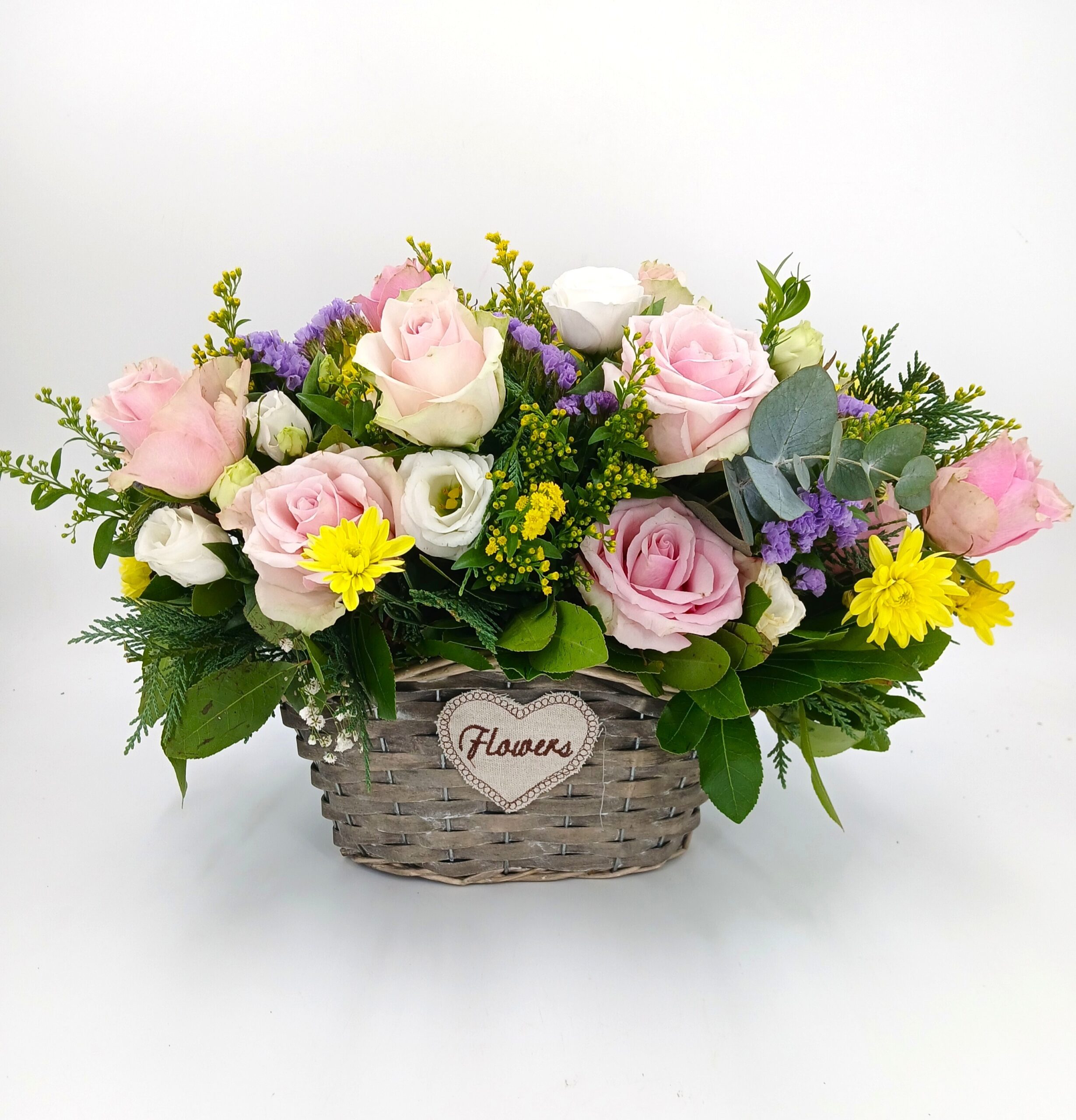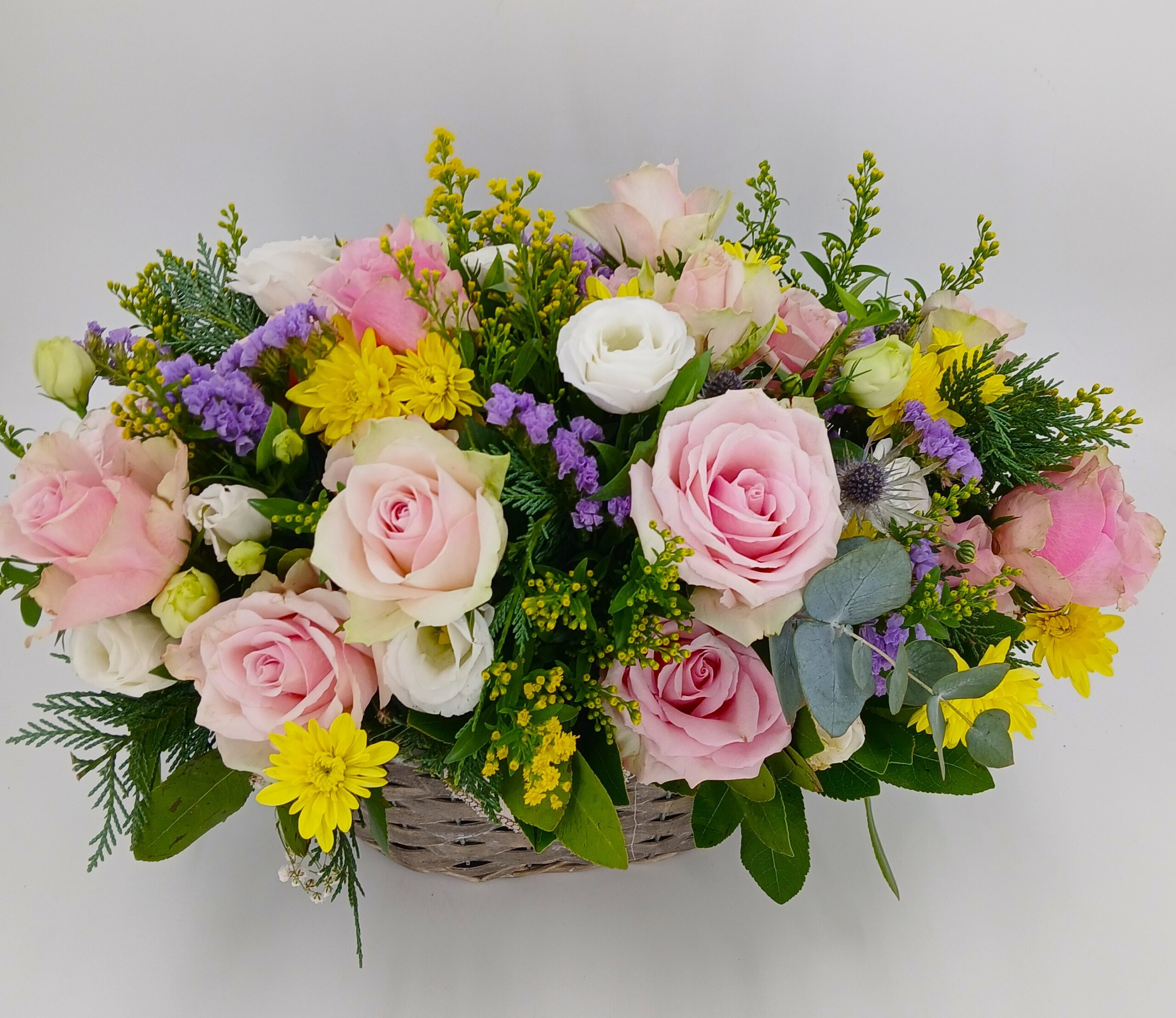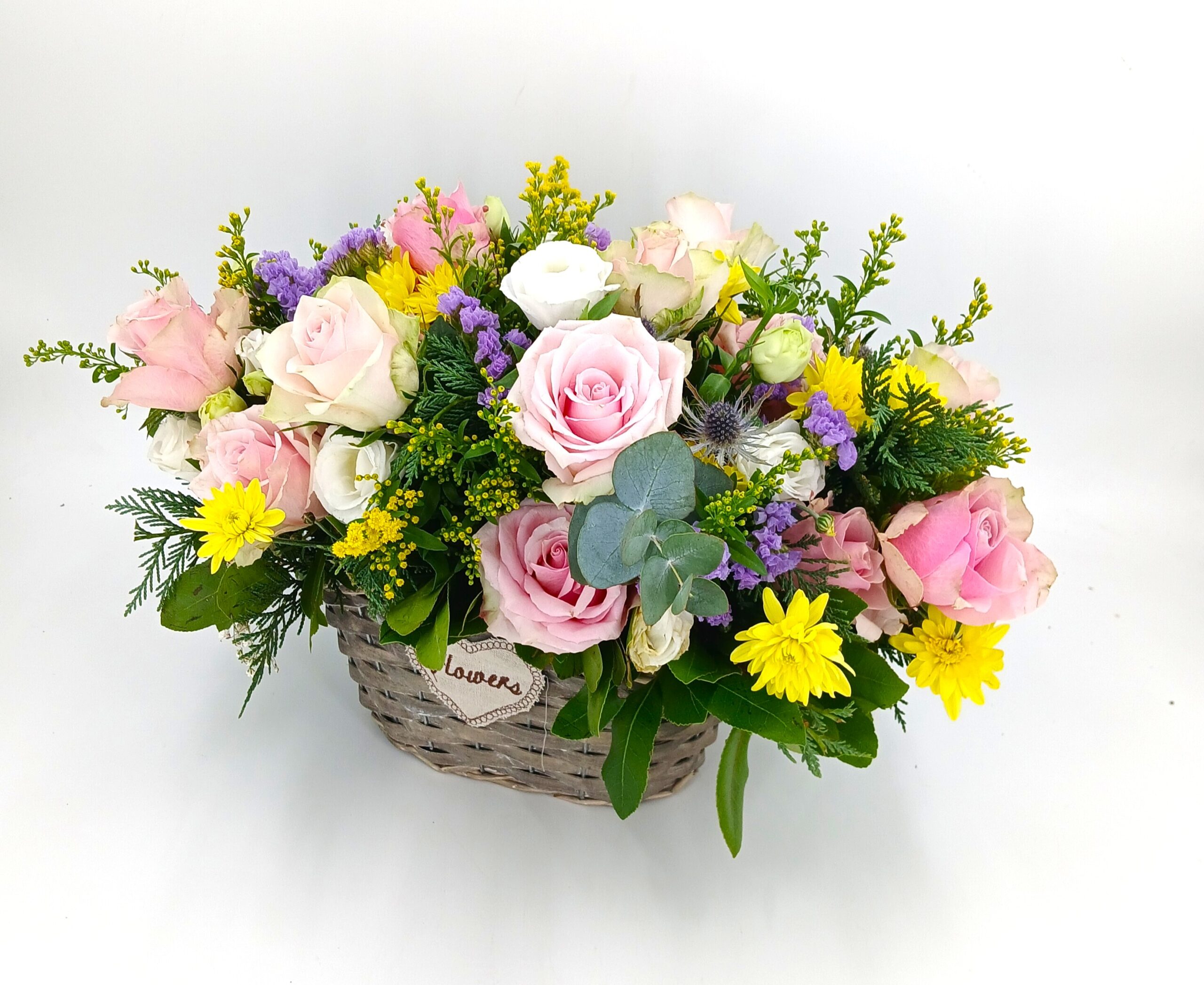 Καλάθι με σύνθεση εποχής, με πολύχρωμα λουλουδια