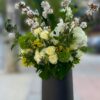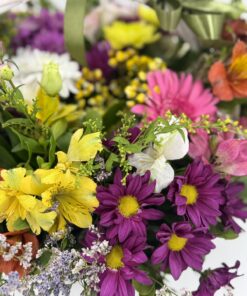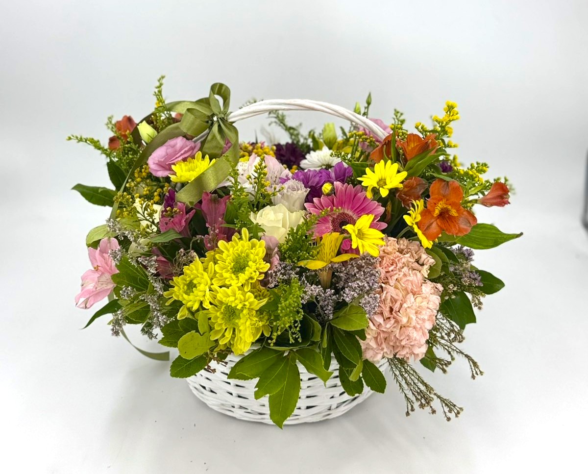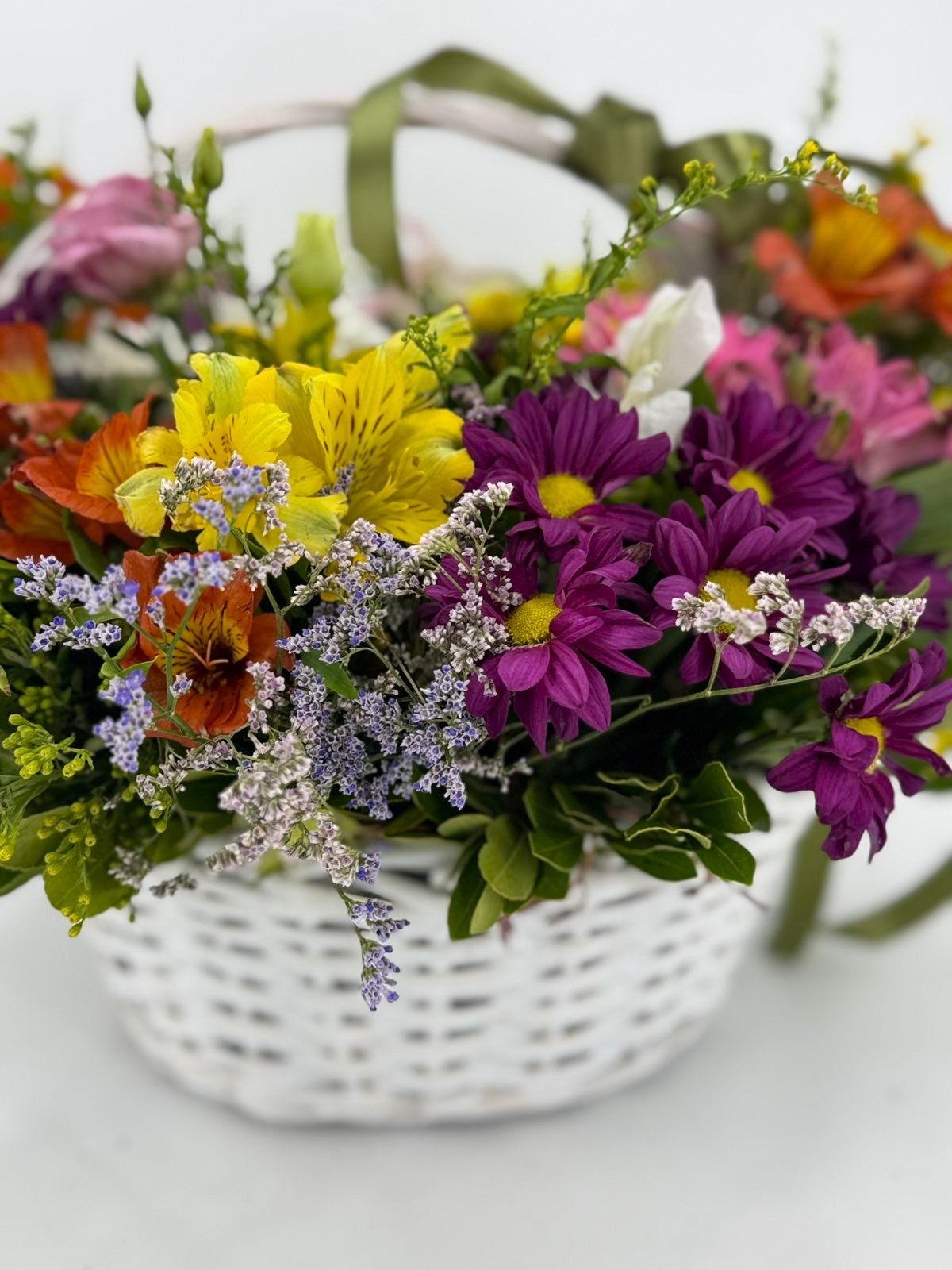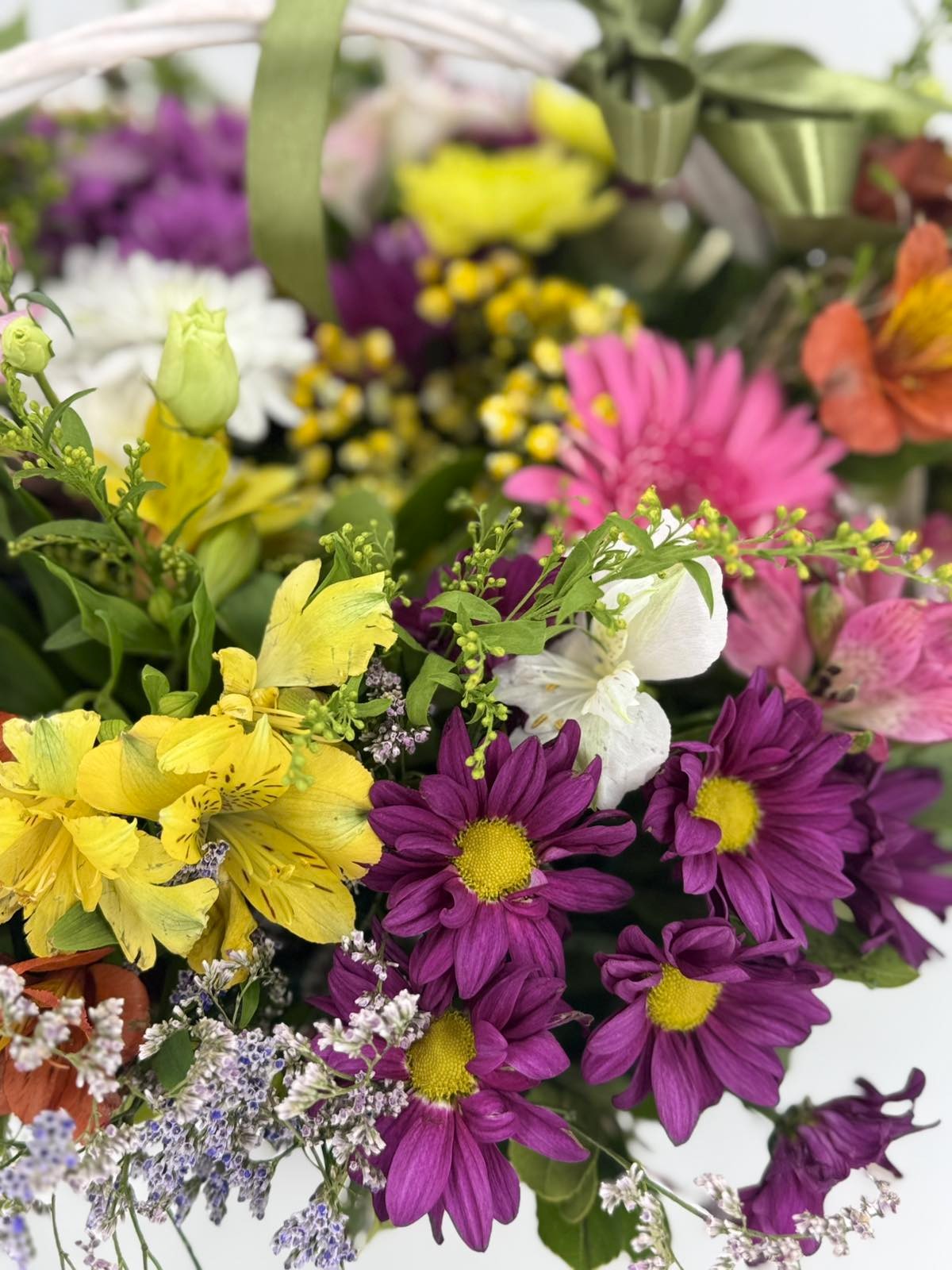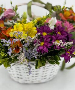 Καλάθι πολύχρωμο με λουλούδια εποχής, χρυσανθεμα, τριανταφυλλα, αλστρομέριες, λιμόνιουμ, λυσίανθος