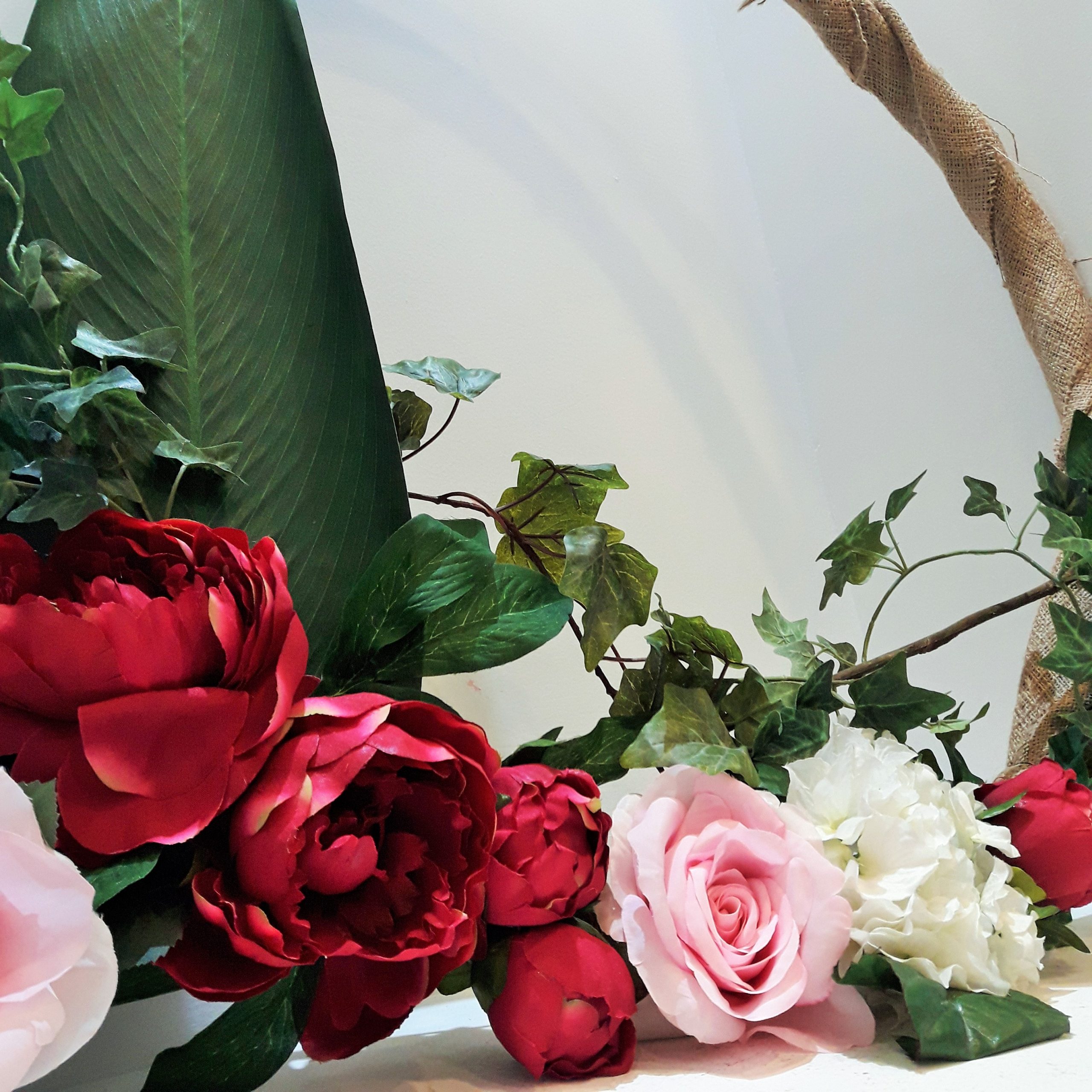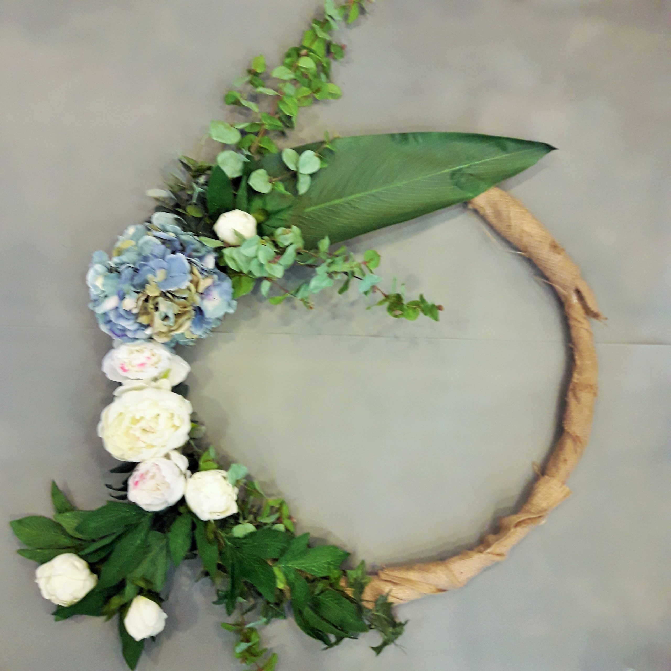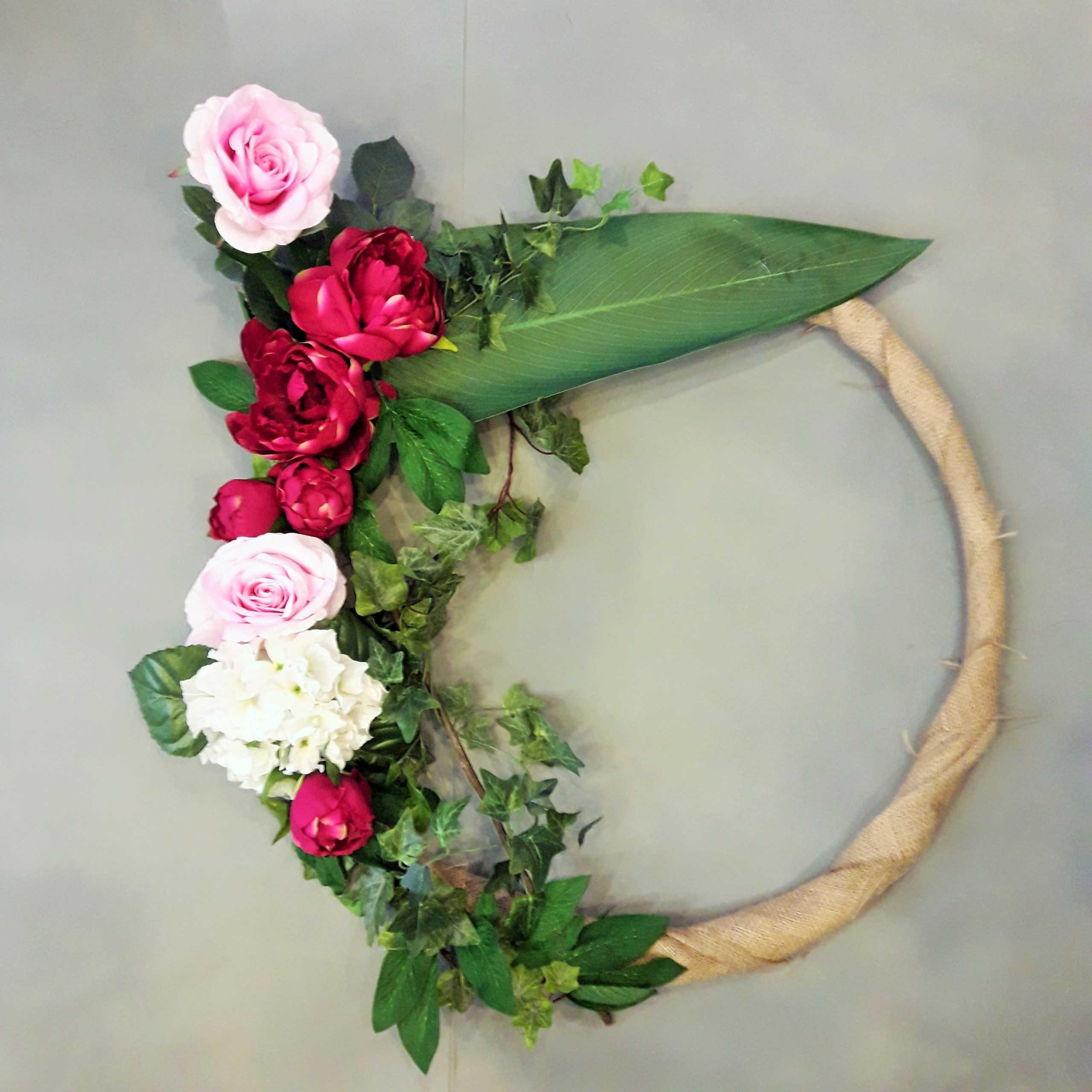 Στεφάνια διακόσμησης με artificial flowers και λινάτσα, Δ60εκ,