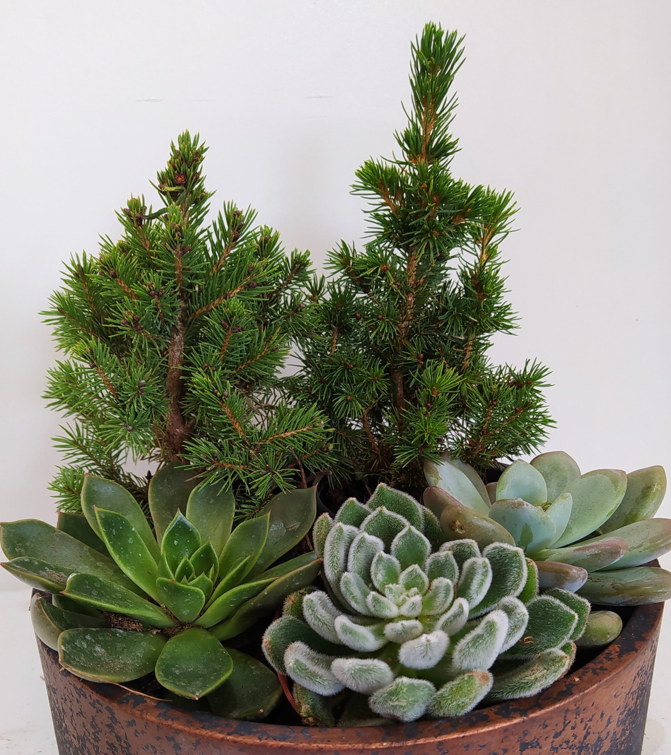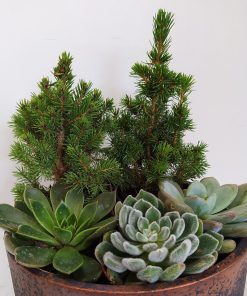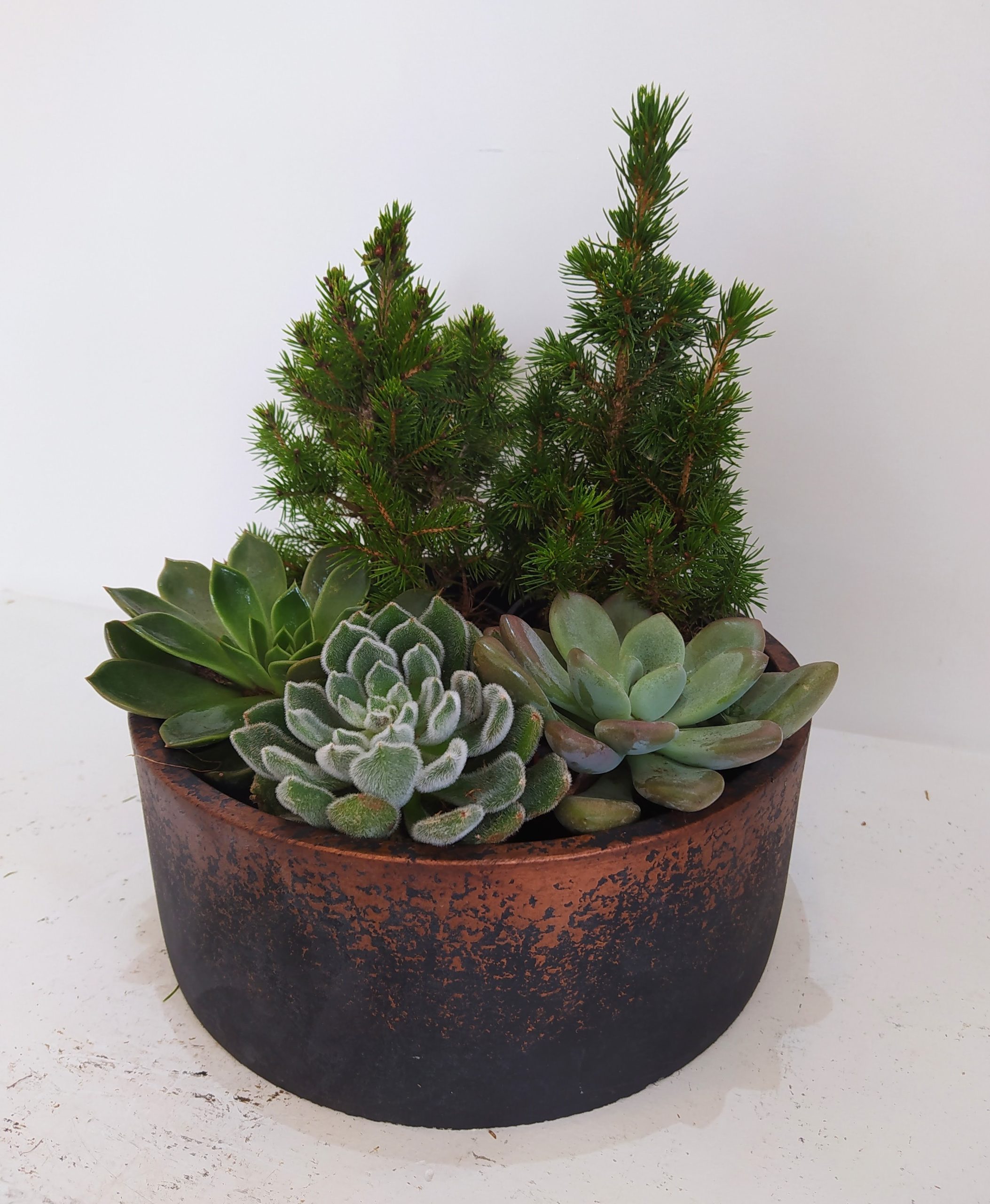 Σύνθεση με φυσικό Έλατο και Παχυφυτα σε pot μπρονζέ