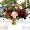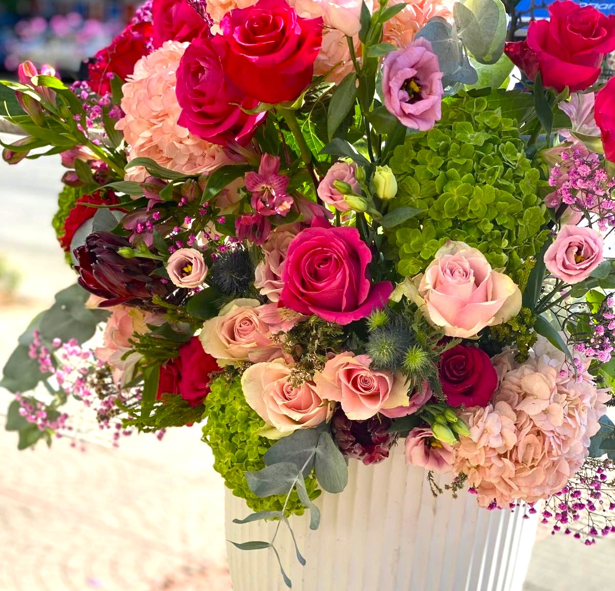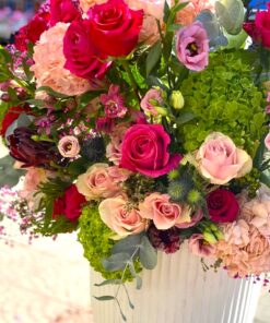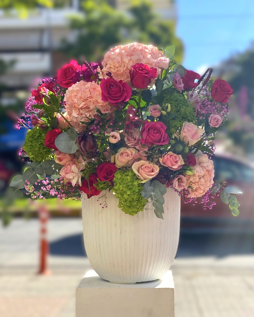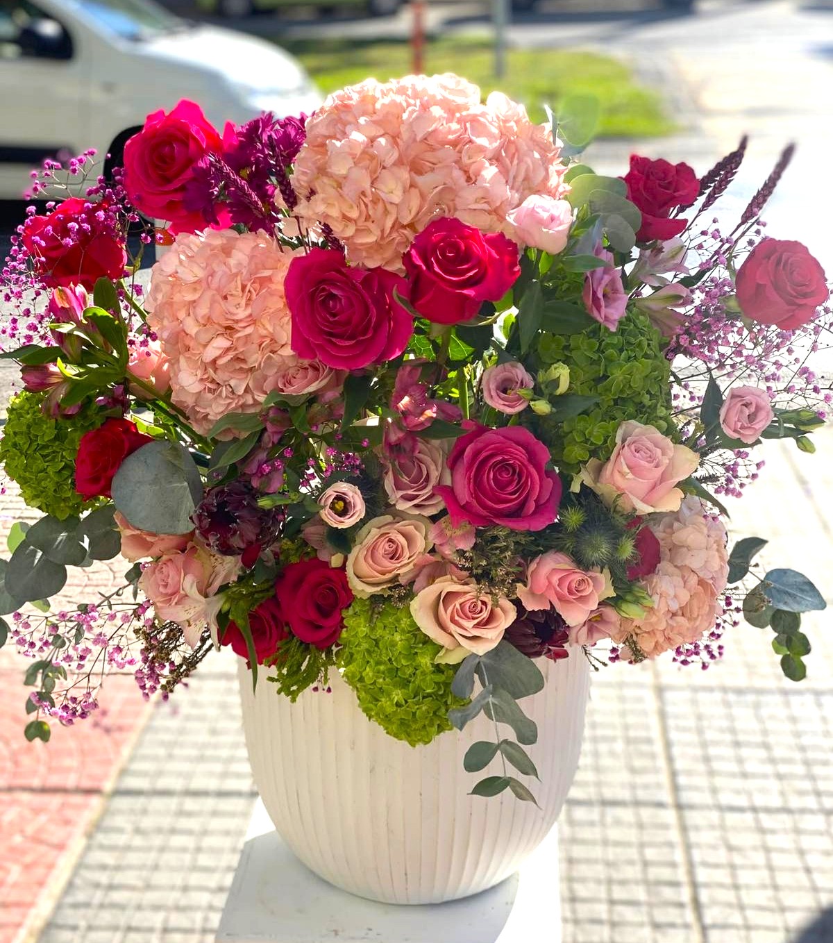 Σύνθεση μπομπέ σε λευκό ecolite pot πολύχρωμη με ορτανσίες λαχανι & peach, τριανταφυλλα peach, φούξια, ροζ παλ, πρωτεα μπορντό, εριγκνουμ, αλστρομεριες φουξια, λυσιανθο ροζ & γυψοφυλλο φουξια