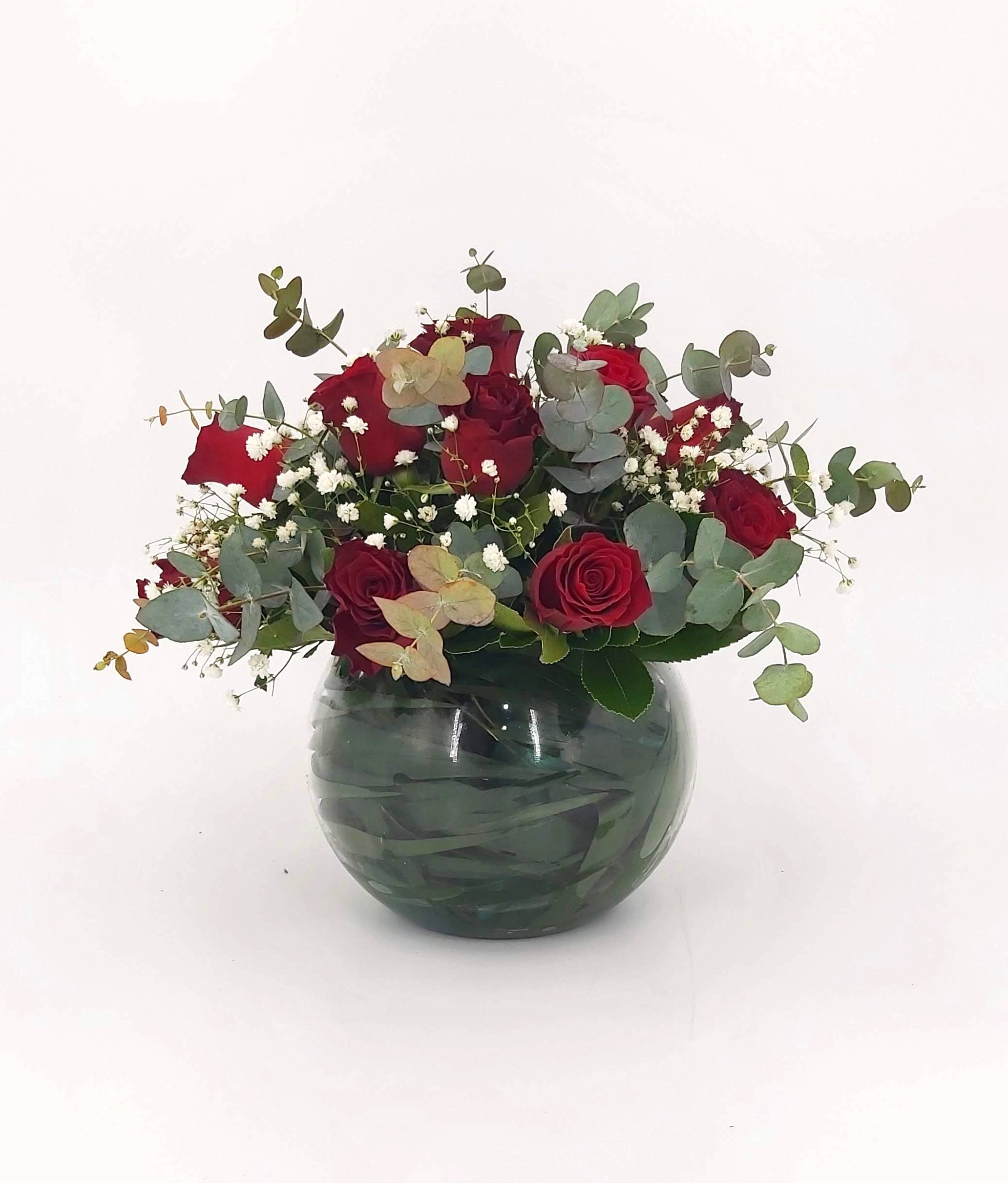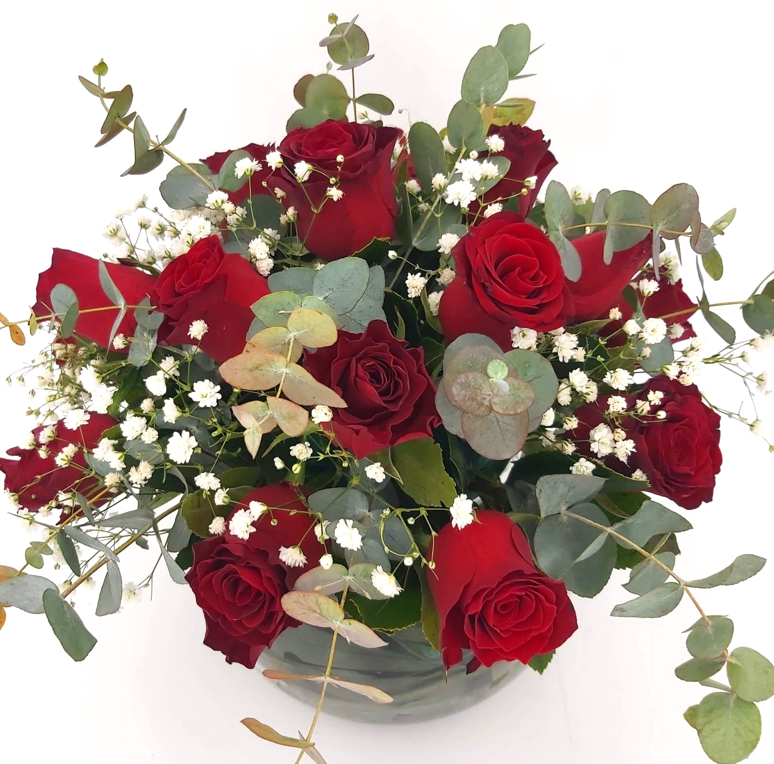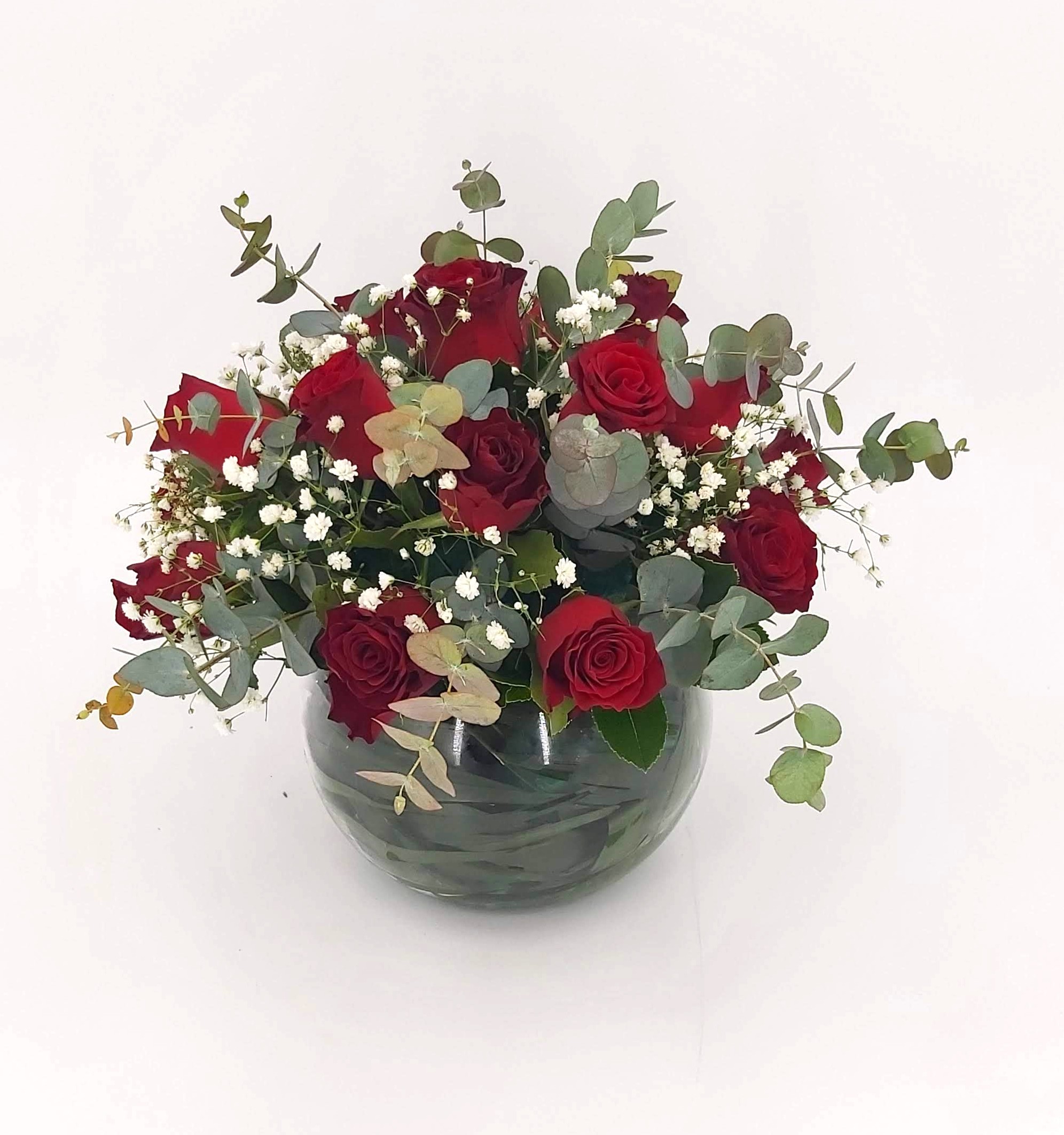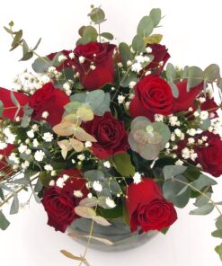 Σύνθεση σε γυάλα, με κοκκινα τριανταφυλλα & baby ευκαλυπτο