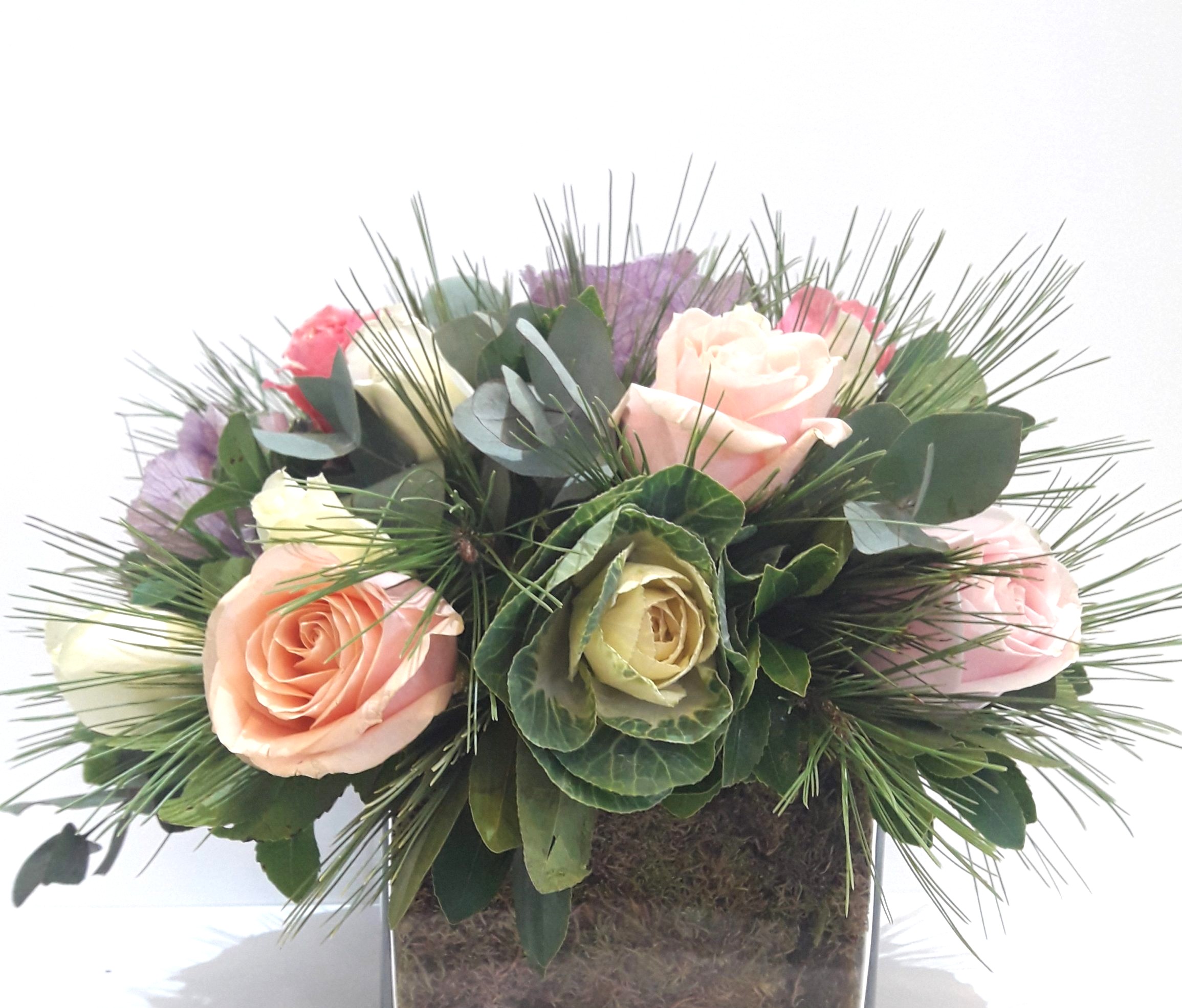Γυάλινος κύβος με μπράσκα, τριαντάφυλλα, πεύκο, ευκάλυπτο και μούσλι. Μ15cm Υ25cm