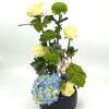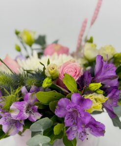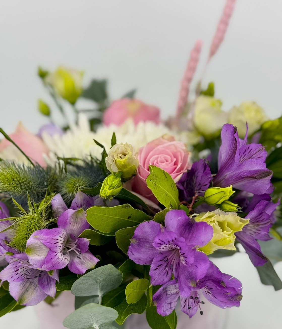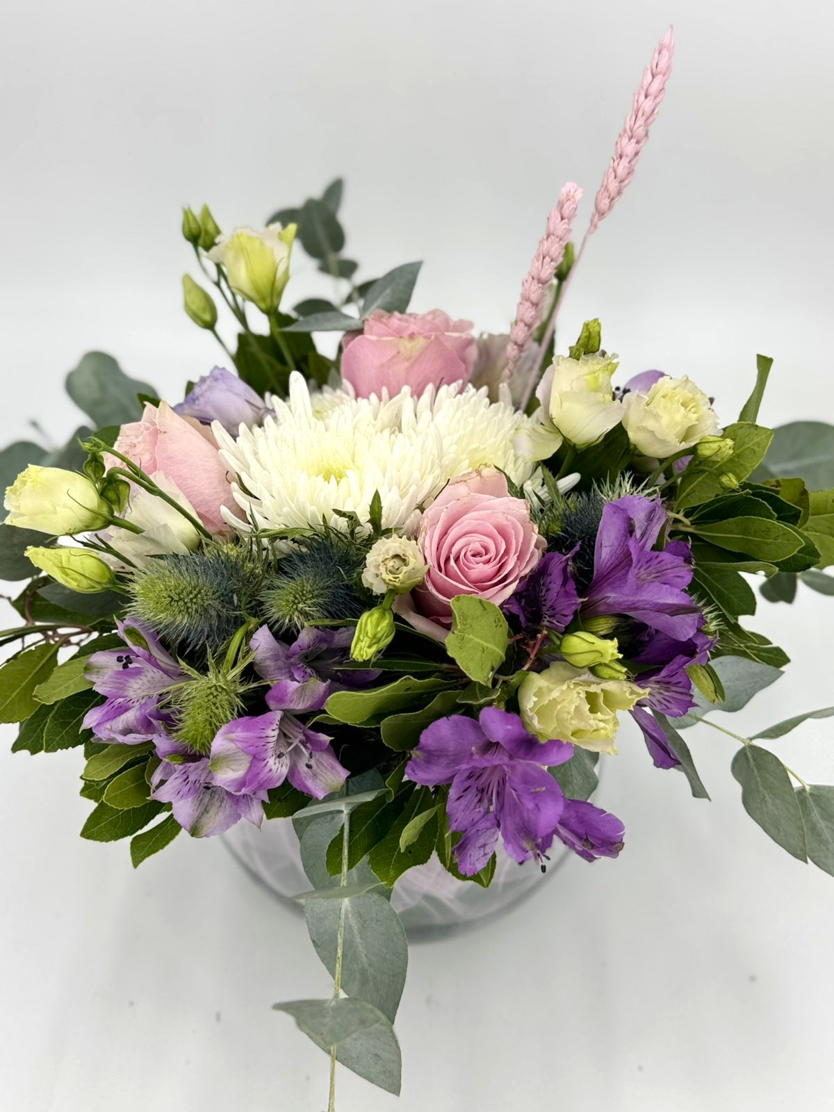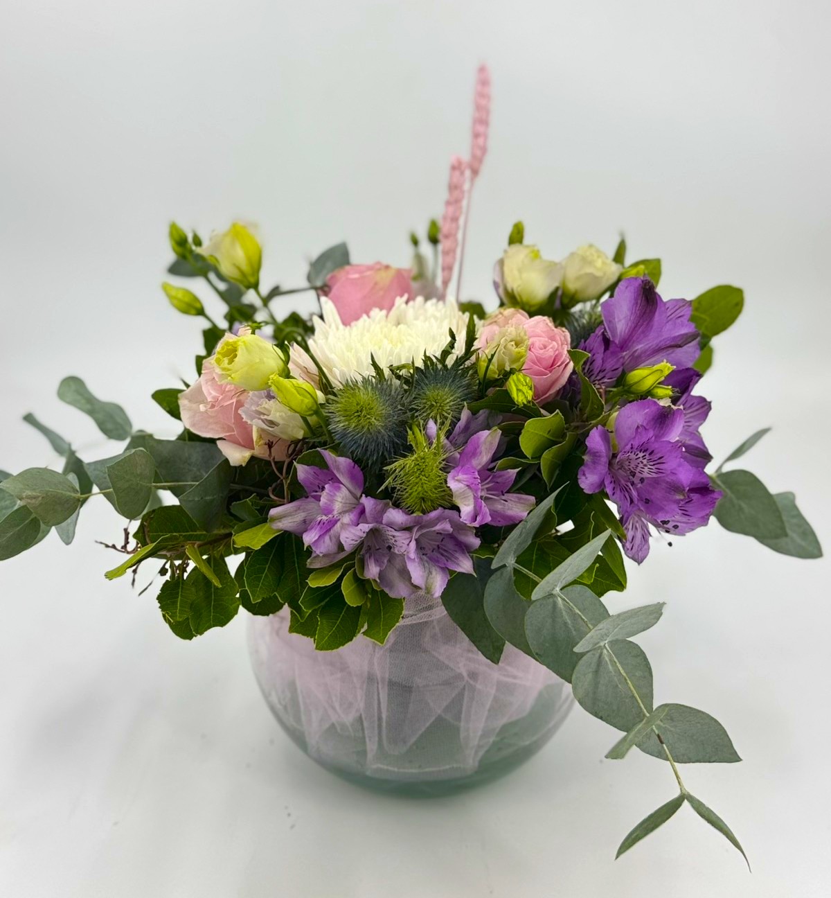 Σύνθεση σε λιλά αποχρώσεις σε γυάλα, με αλστρομέριες λιλα, χρυσάνθεμο λευκό & ροζ τριαντάφυλλα, μπλέ ερίγκνουμ