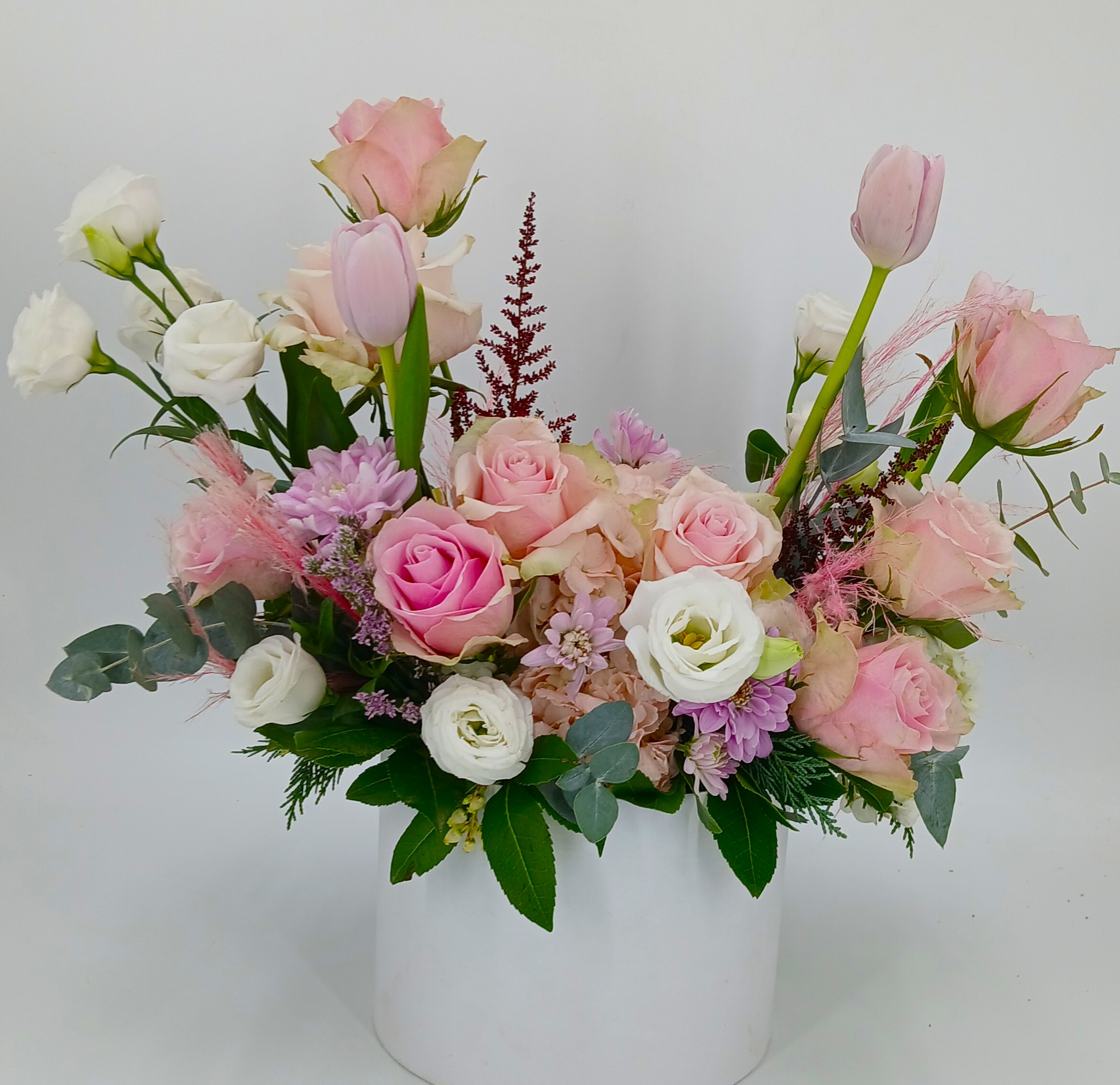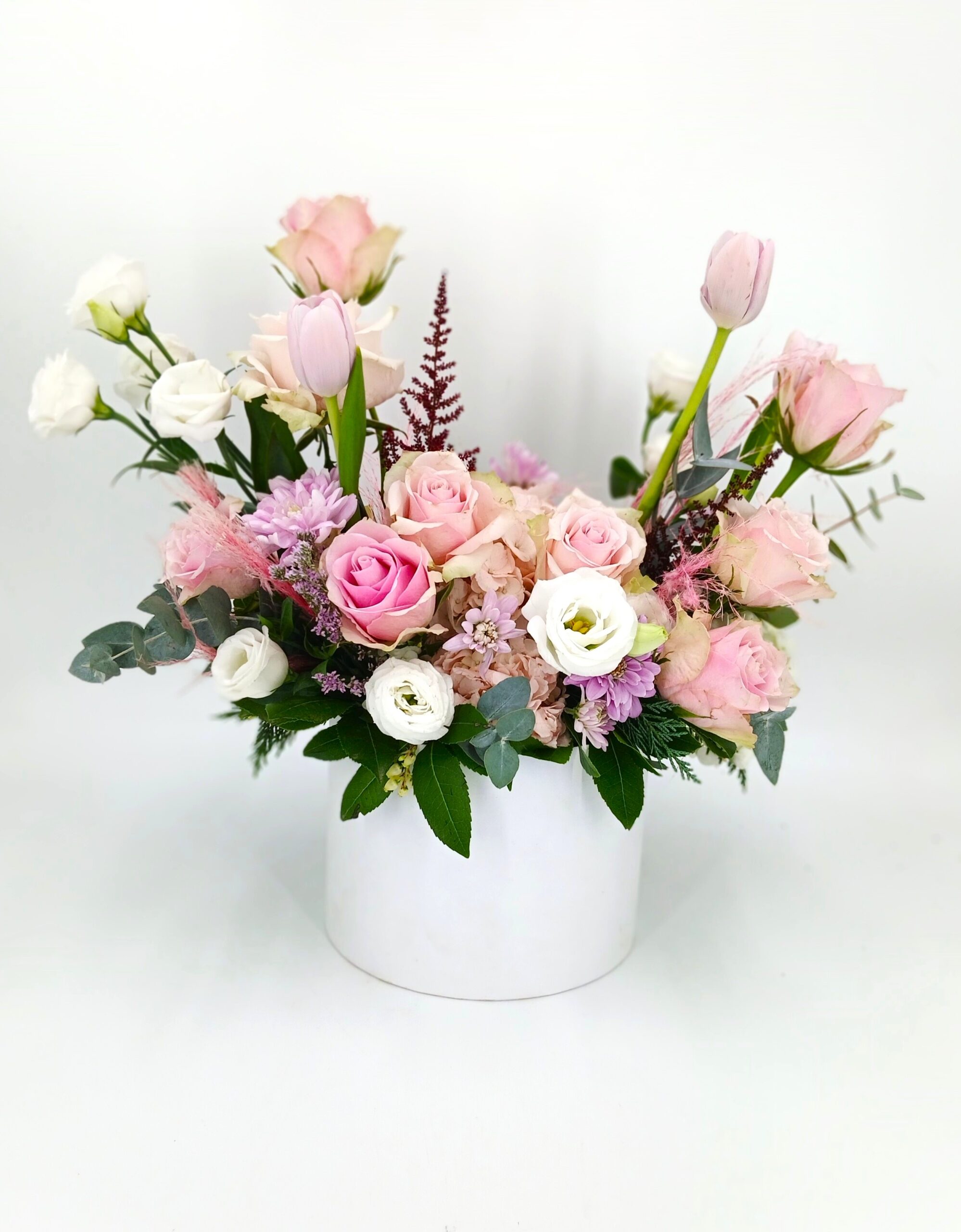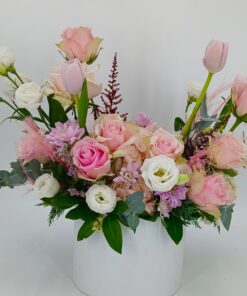 Σύνθεση σε ροζ αποχρωσεις ασύμμετρη σε καπελιέρα, με ροζ παλ τριανταφυλλα, λευκές τουλίπες, λευκό λυσιανθο, χρυσανθεμα & astible