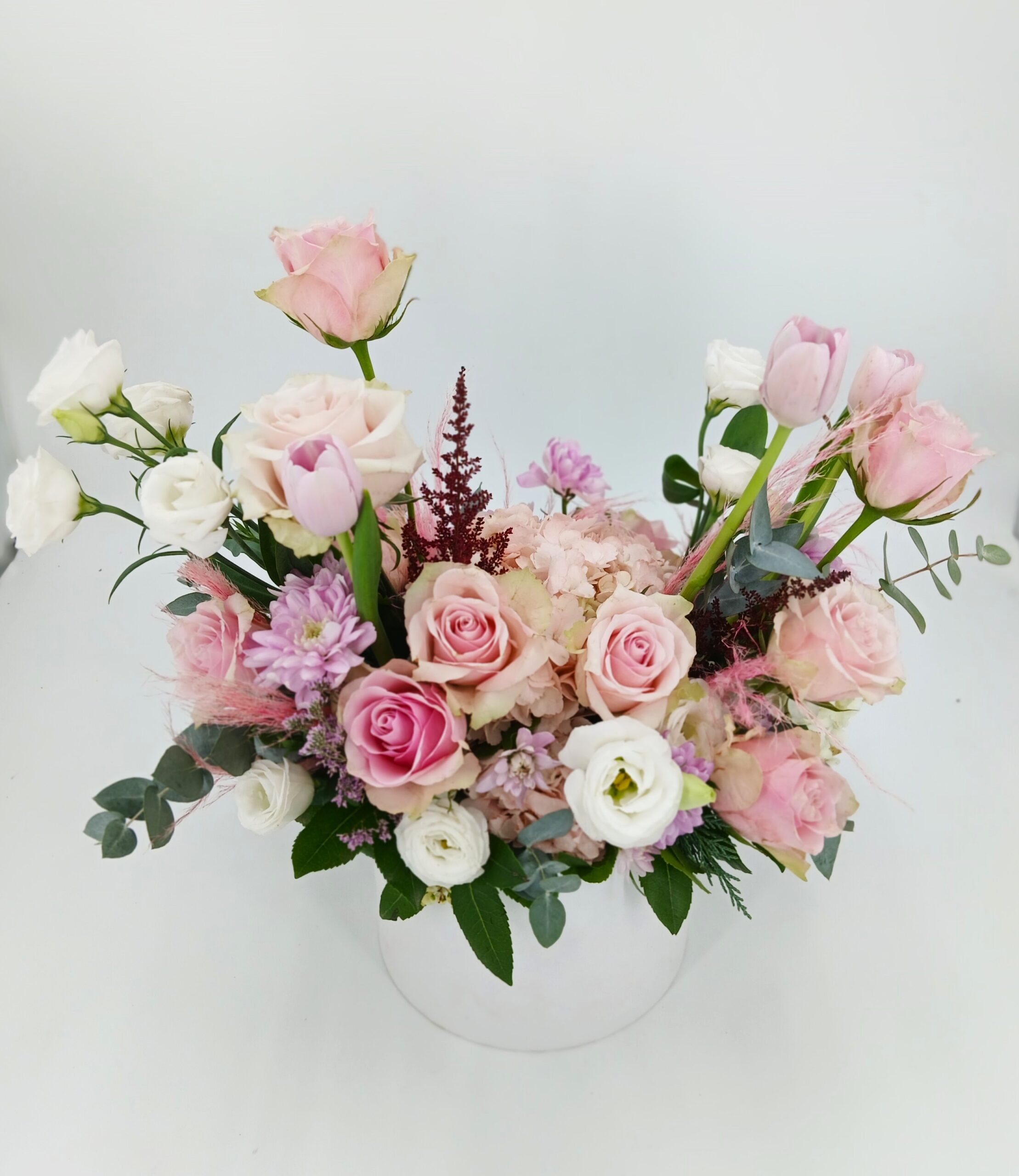 Σύνθεση σε ροζ αποχρωσεις ασύμμετρη σε καπελιέρα, με ροζ παλ τριανταφυλλα, λευκές τουλίπες, λευκό λυσιανθο, χρυσανθεμα & astible