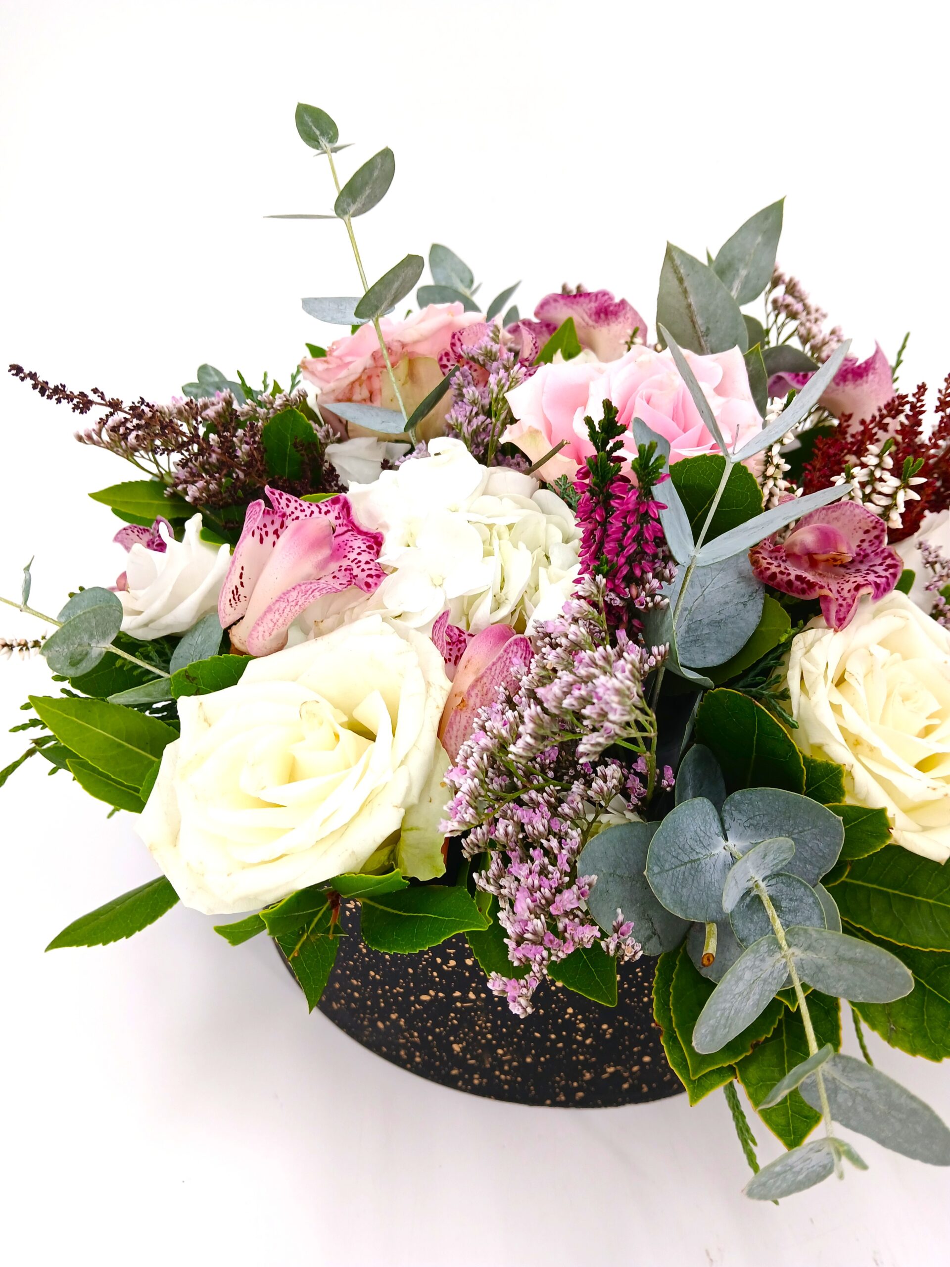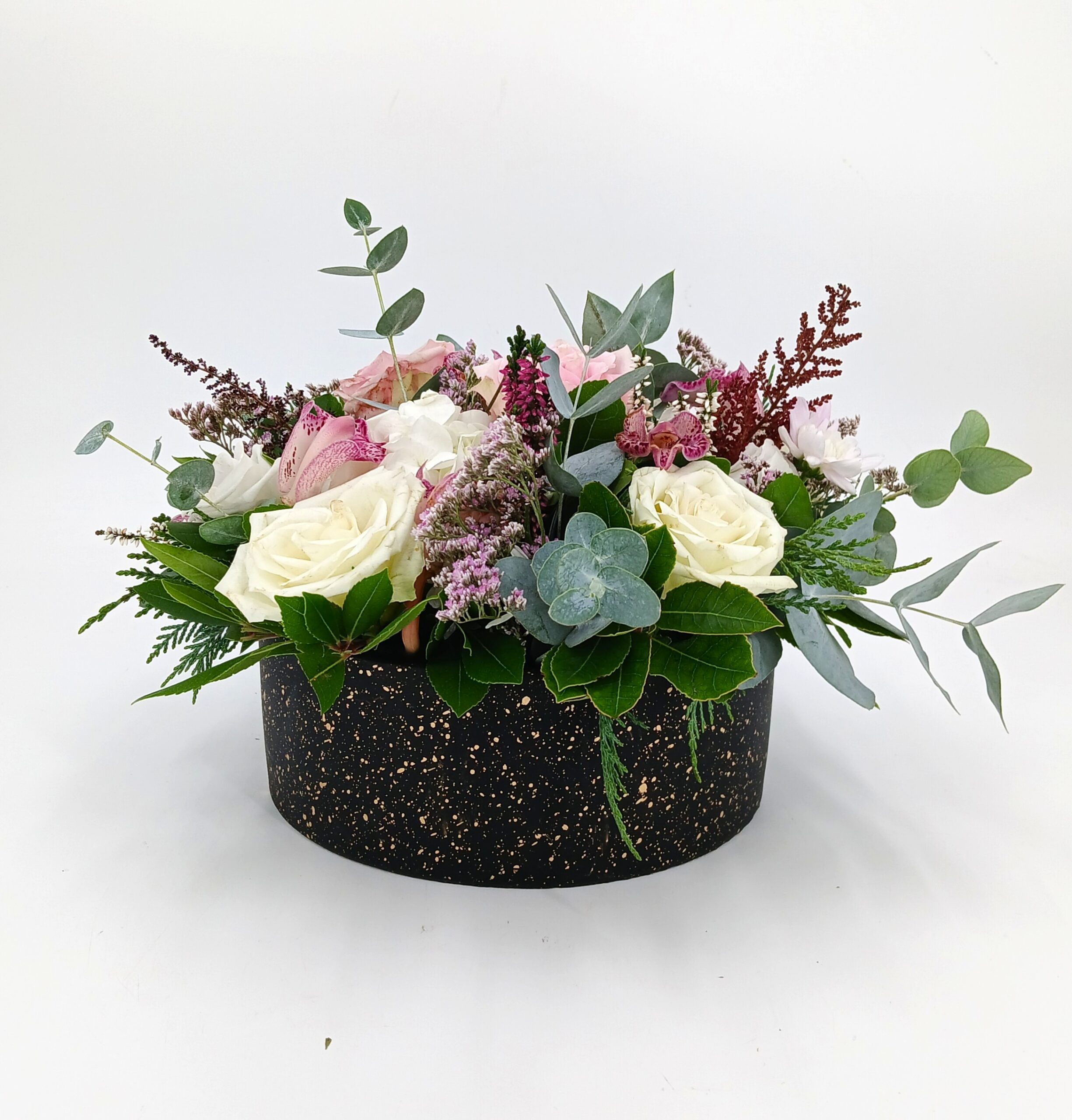 Σύνθεση σε στρογγυλό κασπό μαύρο τσιμεντένιο, με ορχιδεα σιμπιτιουμ, ορτανσιες λευκές,τριανταφυλλα,astible & λεμονιουμ μωβ