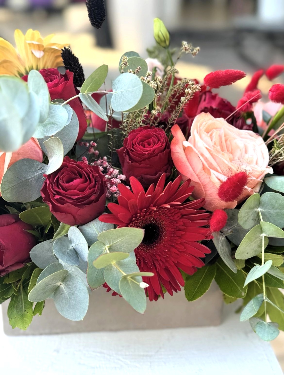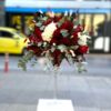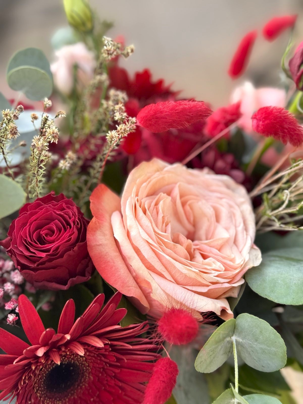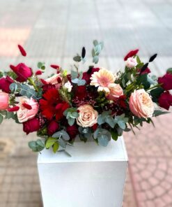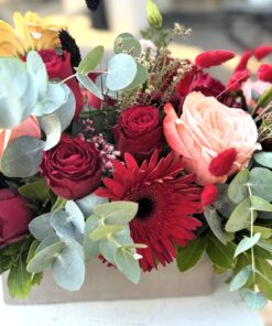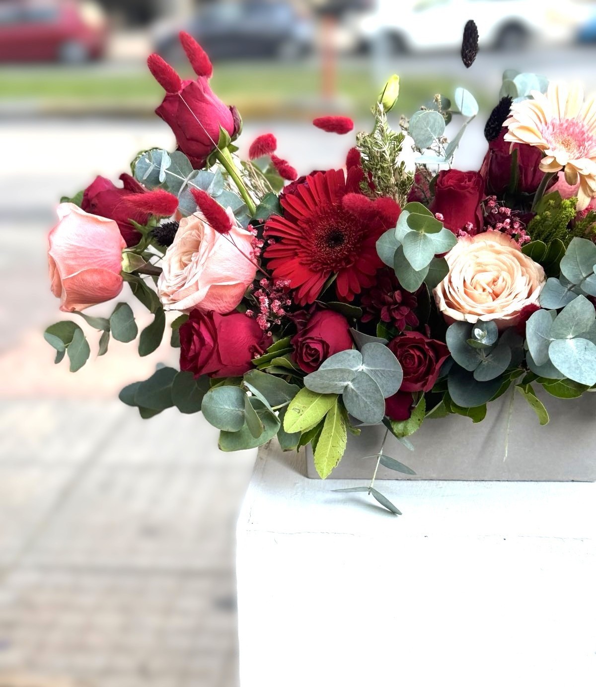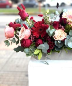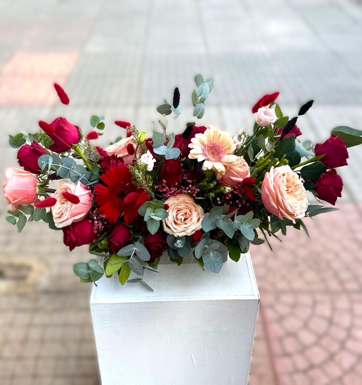 Συνθεση σε Τσιμεντένιο Μακρόστενο σε αποχρωσεις ροζ, σομον, κοκκινο με λουλουδια εποχής