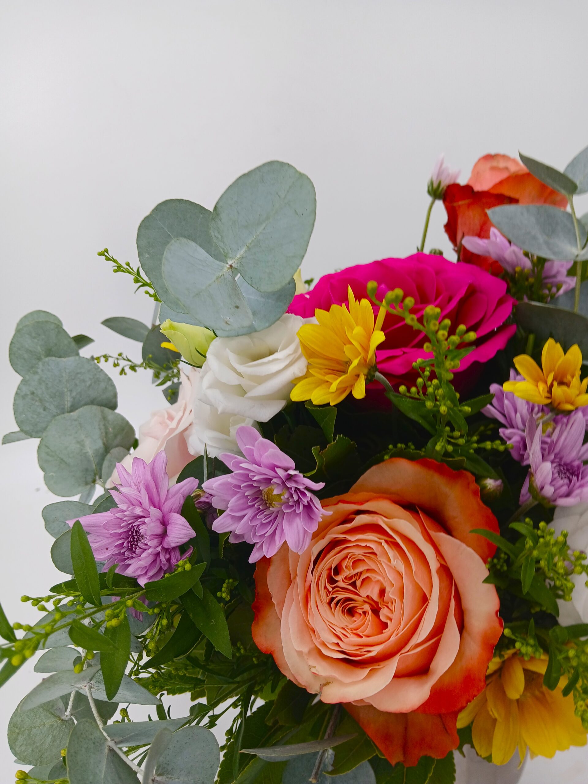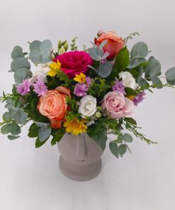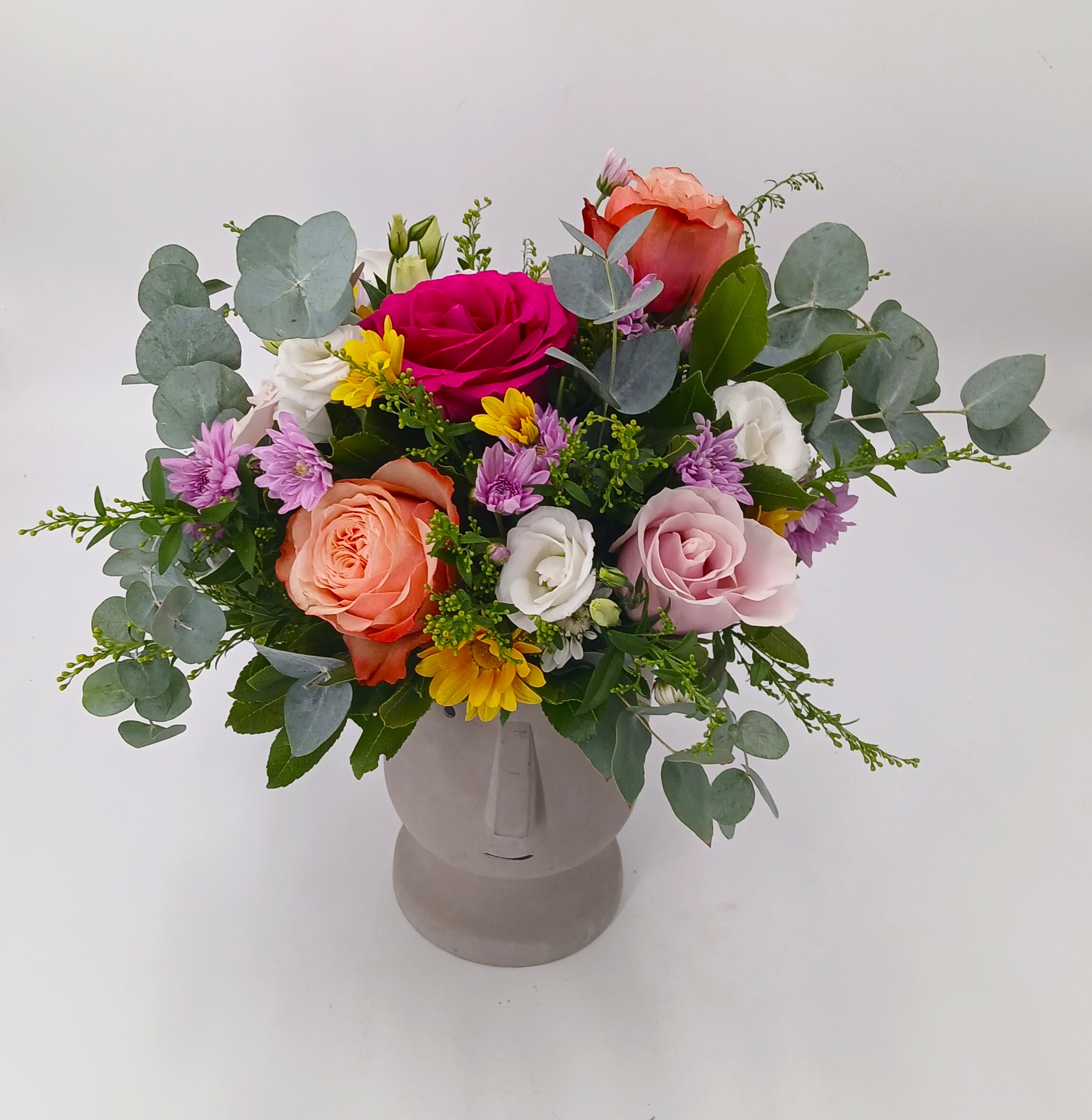 Σύνθεση σε τσιμεντενιο pot πρόσωπο, σε σομόν, ροζ & λευκή απόχρωση με baby ευκάλυπτο