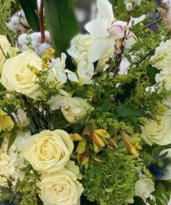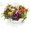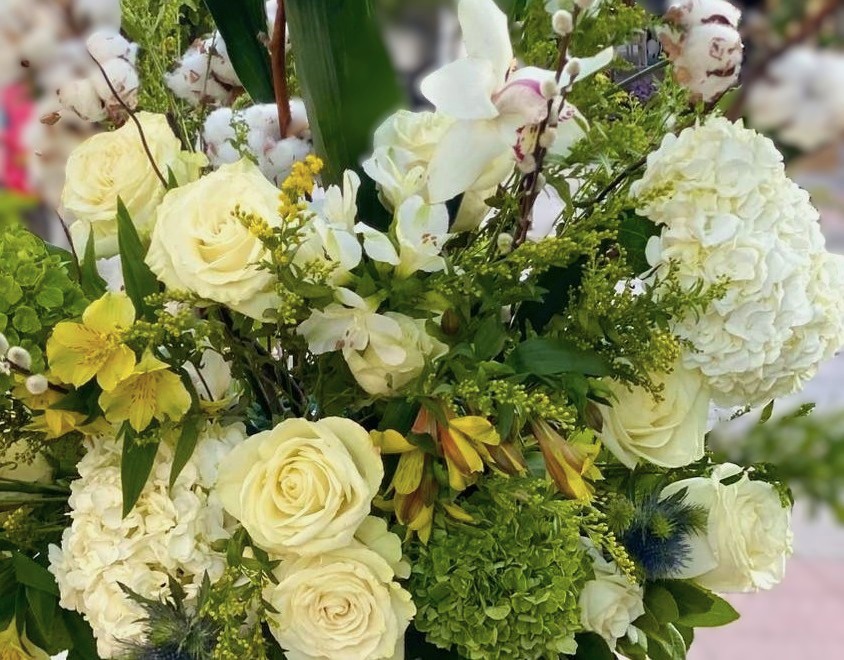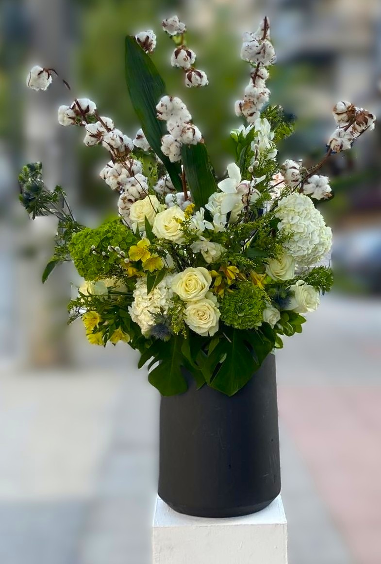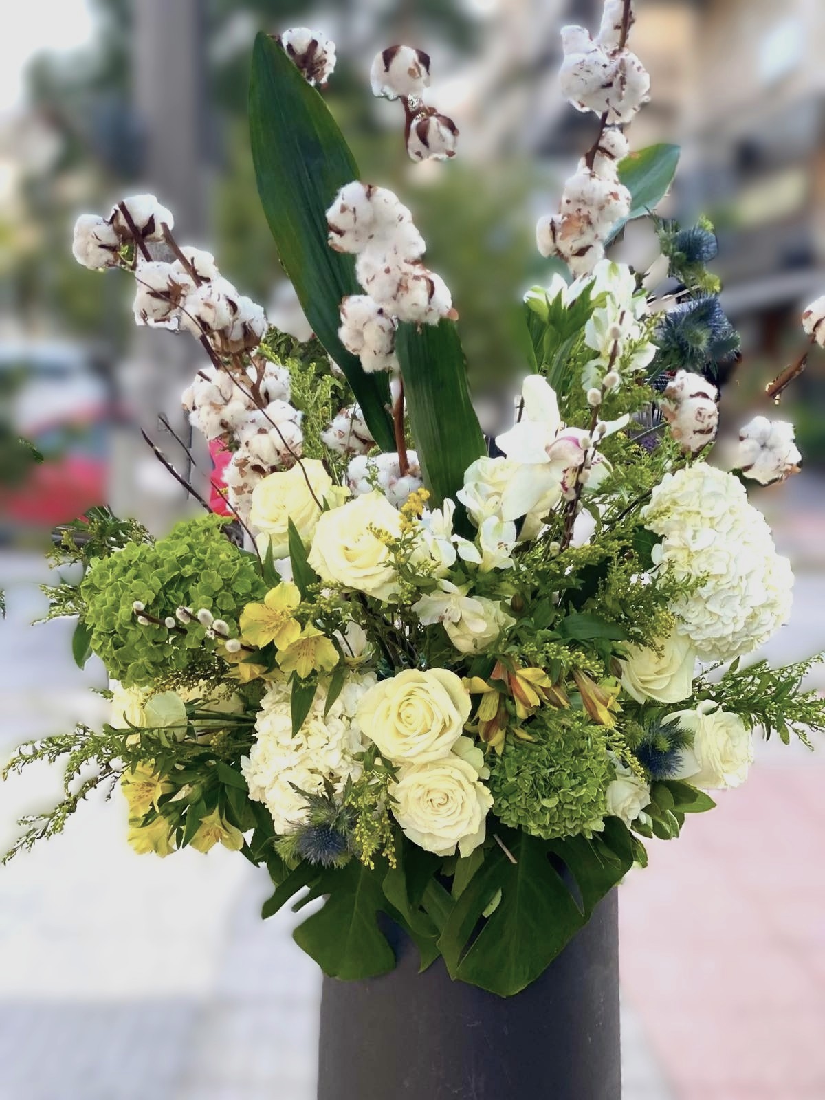 Σύνθεση σε ecolite ποτ με βαμβάκια, ορτανσίες, αλστρομέριες, τριανταφυλλα σε φυσικούς χρωματισμούς με λουλουδια εποχιακα.