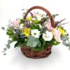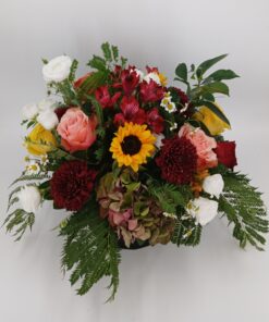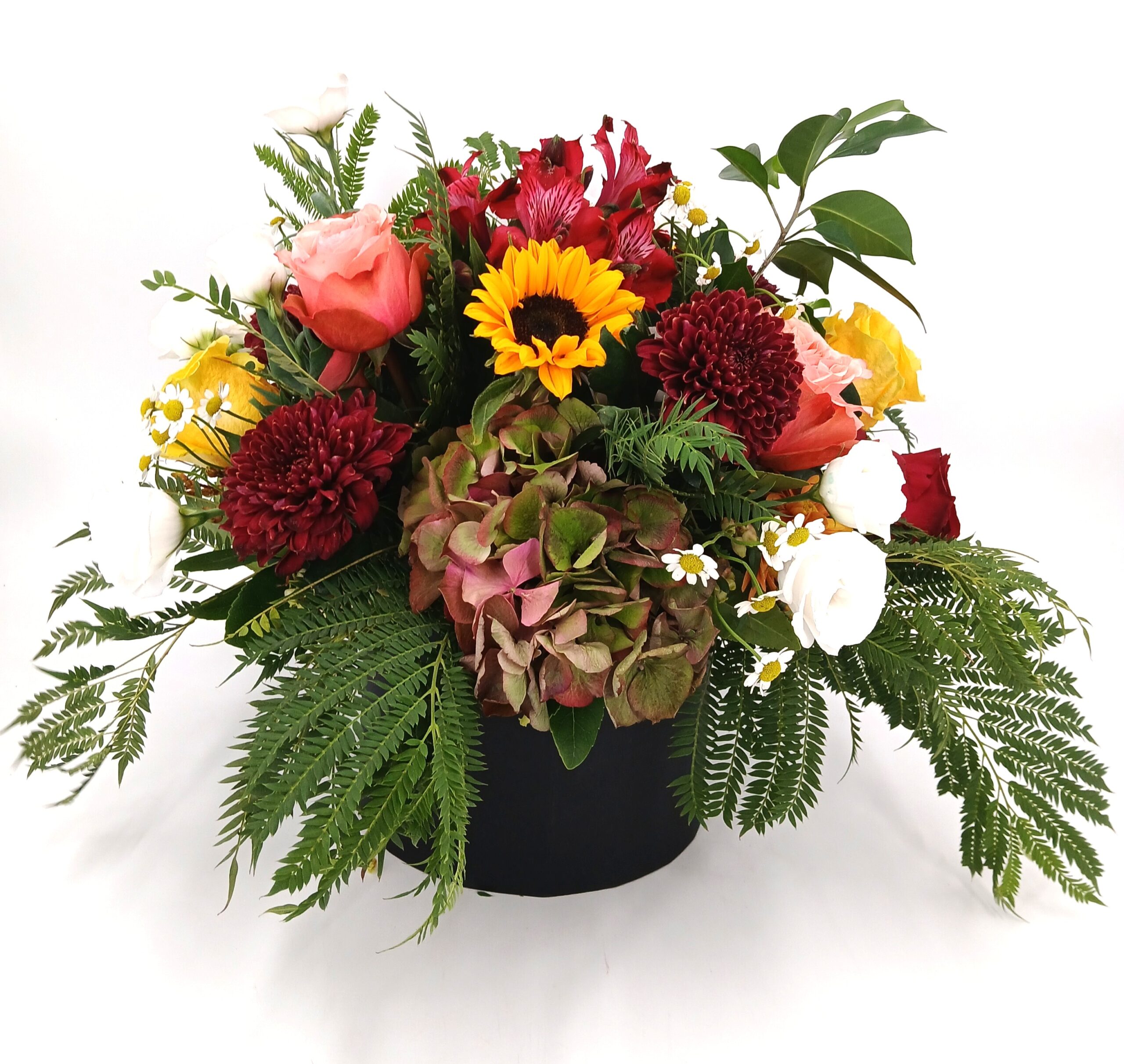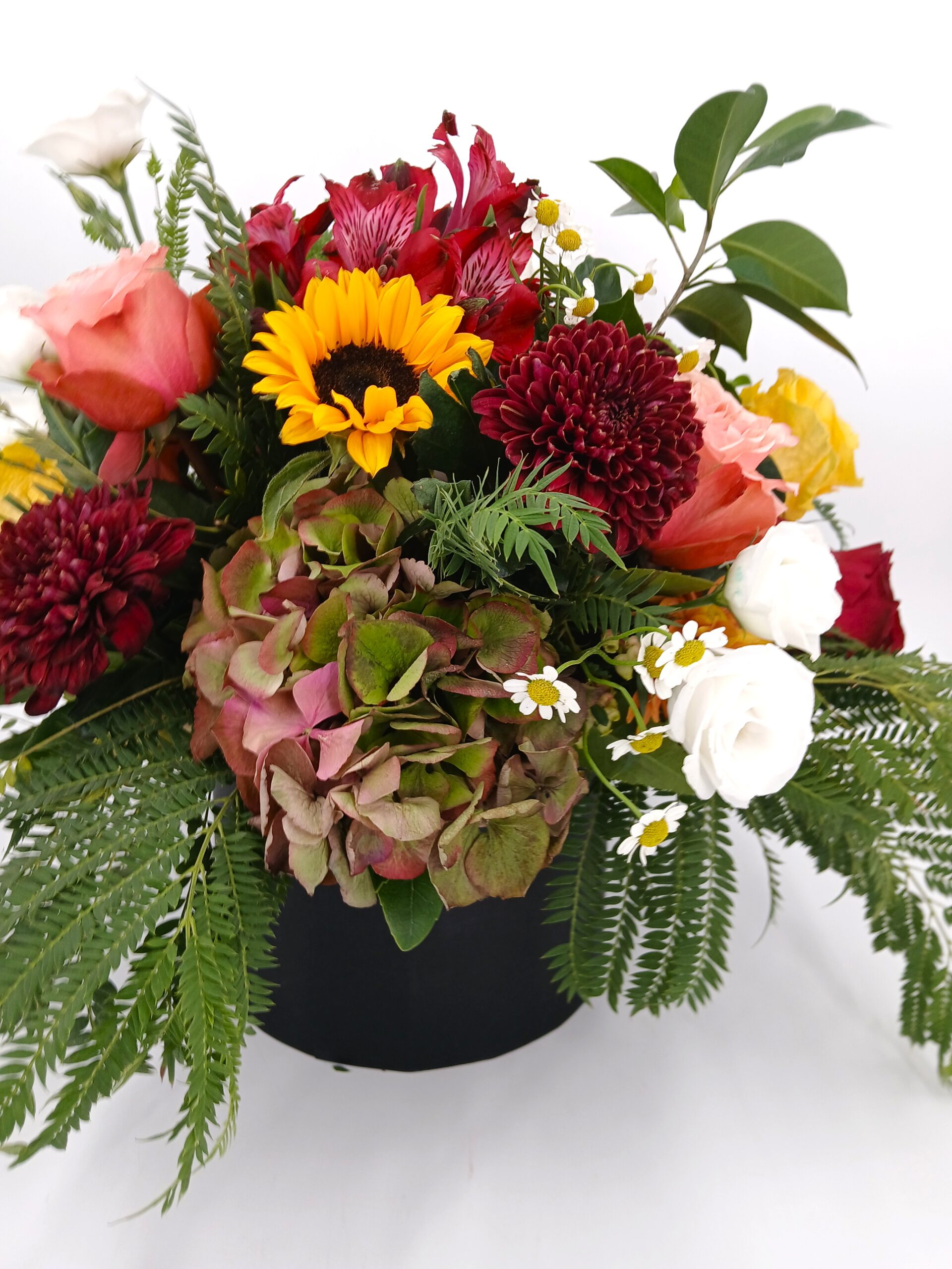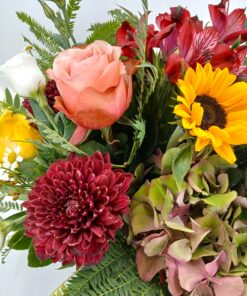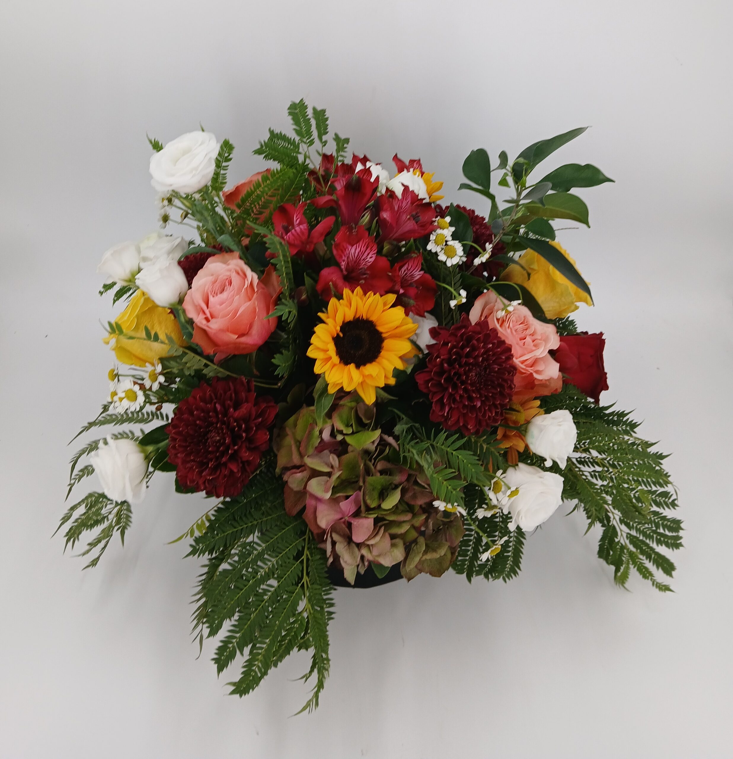 Σύνθεση freestyle σε μπορντό & peach αποχρώσεις, με τριαντάφυλλα, ορτανσία μπορντό, λευκό λυσιανθο, χρυσάνθεμα μπορντό, ηλιους, φυλλώματα & κοκκινες αλστρομεριες