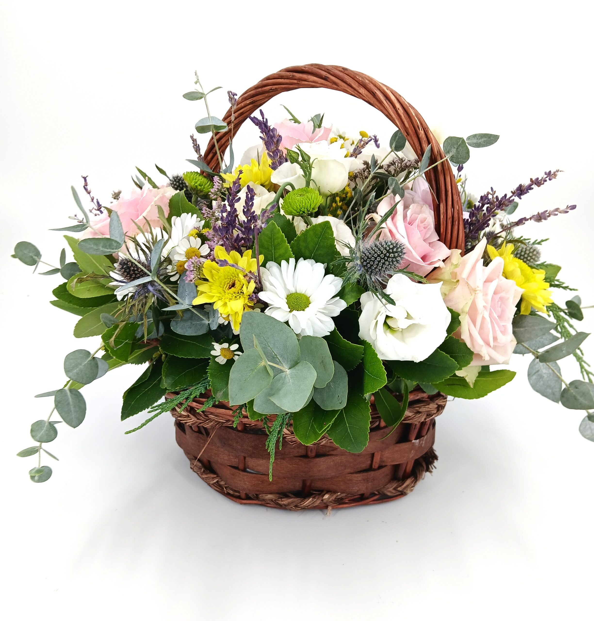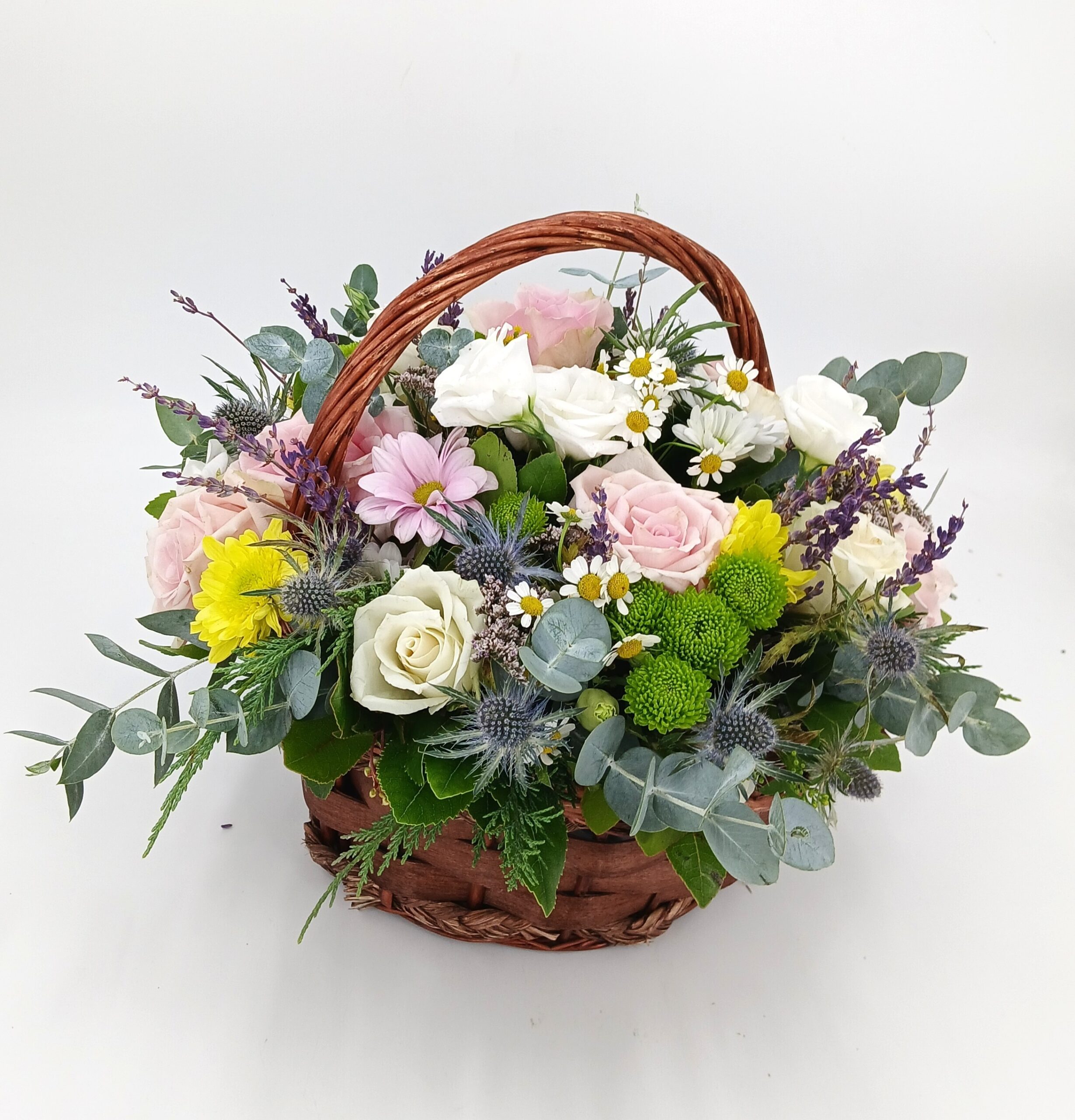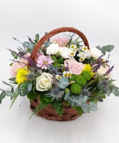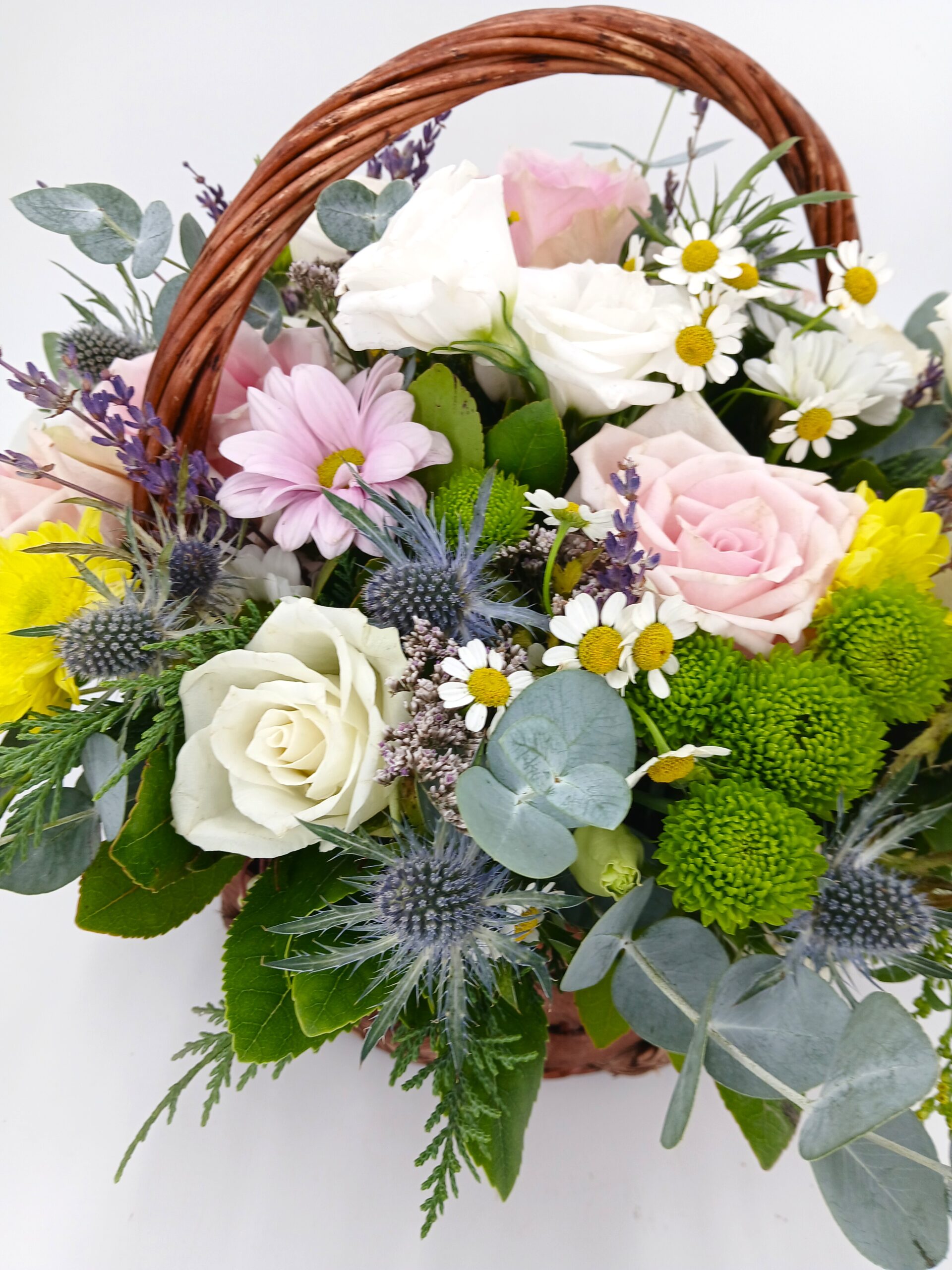 Σύνθεση mix σε Καλάθι, με ερίγκνουμ, τριανταφυλλα, χρυσανθεμα, χαμομηλι & λευκό λυσιανθο