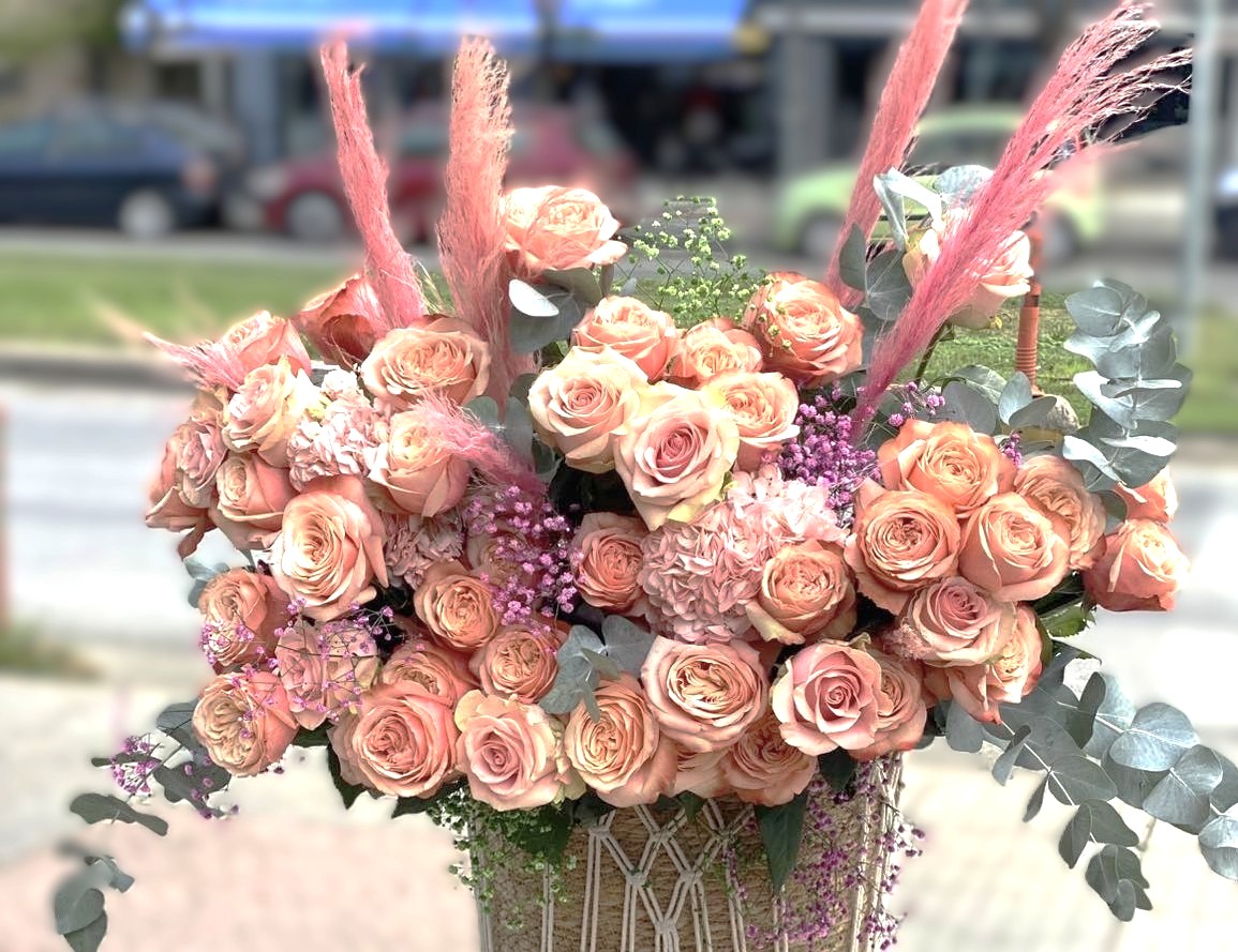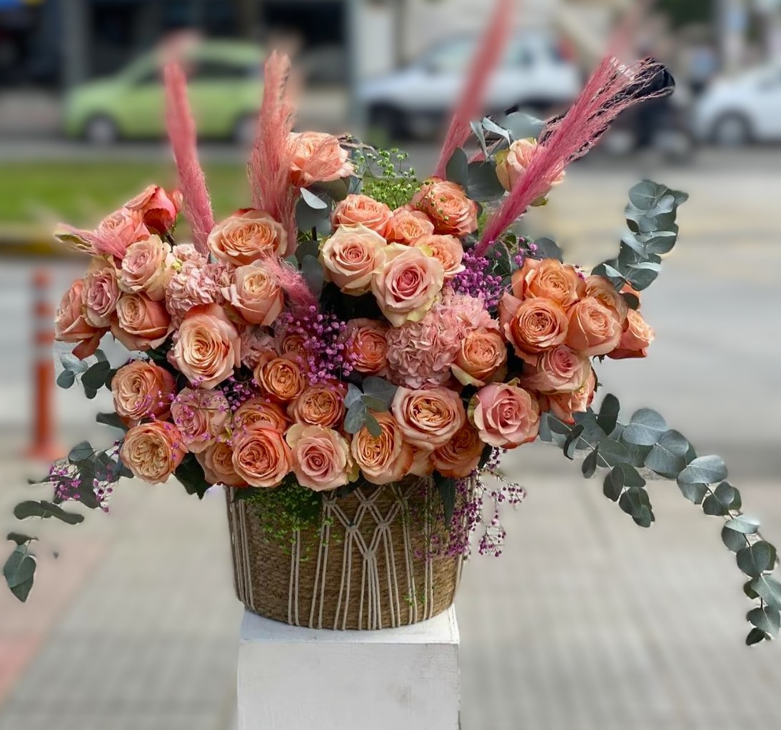 Σύνθεση Peach & Ροζ σε φυσικό Καλάθι