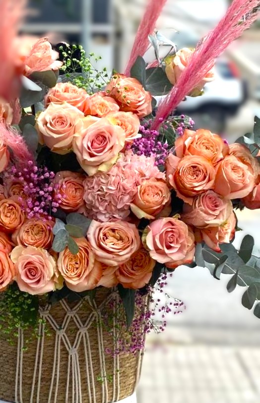Σύνθεση σε Peach & Ροζ σε φυσικό Καλάθι, με τριανταφυλλα, ορτανσίες, γυψοφυλλη.