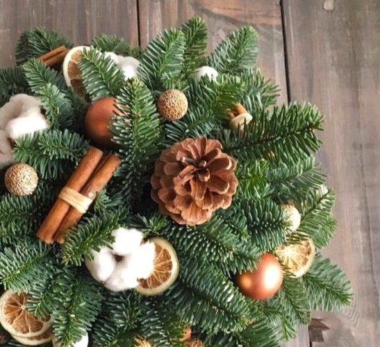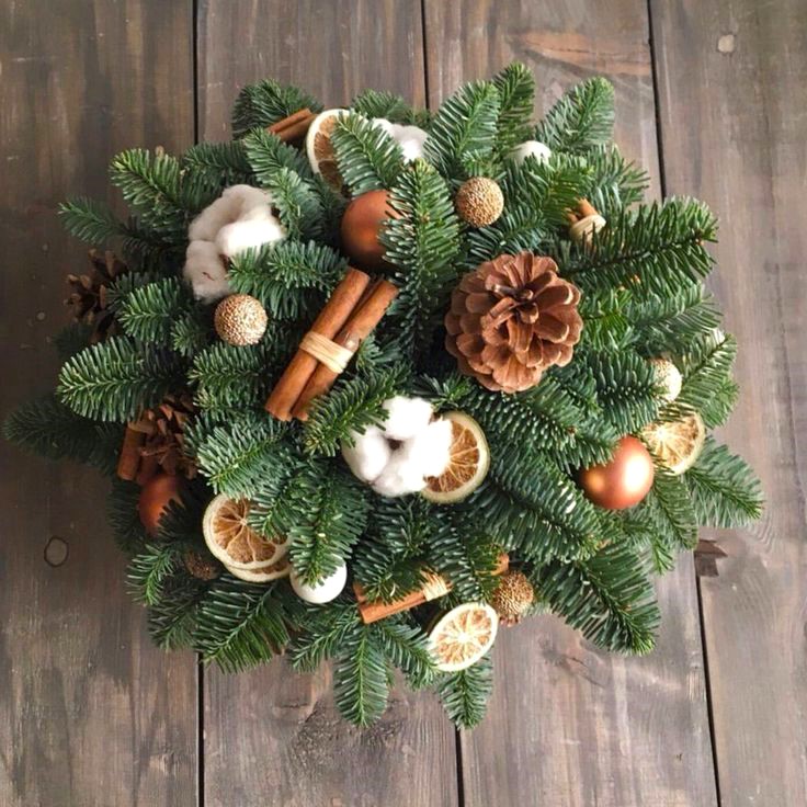 Χριστουγεννιάτικη σύνθεση με βαμβακι, έλατο, κανέλα, μπάλες χρυσές & πορτοκαλια