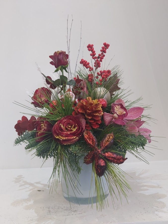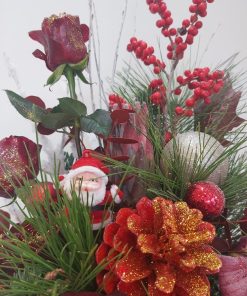 Χριστουγεννιάτικη Σύνθεση σε Λευκό pot, με ιλεχ, ελατο, πευκο, τριανταφυλλα, ευκαλυπτο κόκκινο και διακοσμητικά στοιχεια.