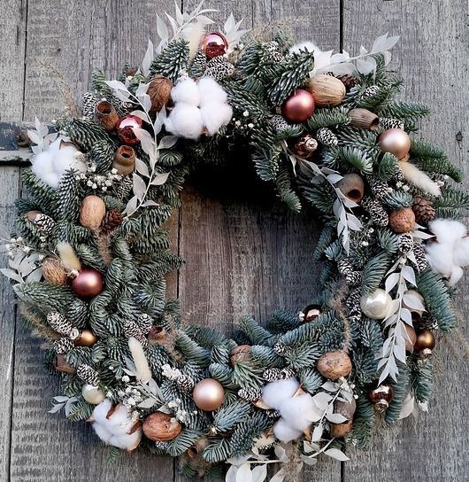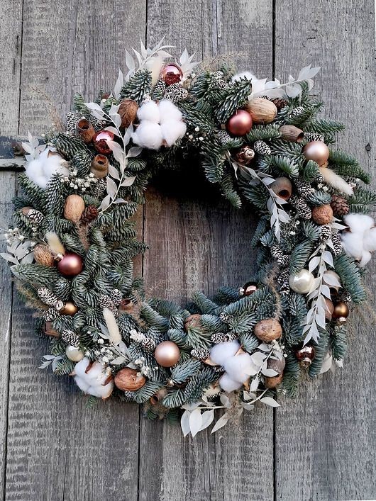 Χριστουγιεννιατικο Στεφανι σε μπεζ χρυσό αποχρώσεις, με χρυσες μπάλες, καρυδια, διακοσμητικους καρπους, κουκουναρια & ελατα
