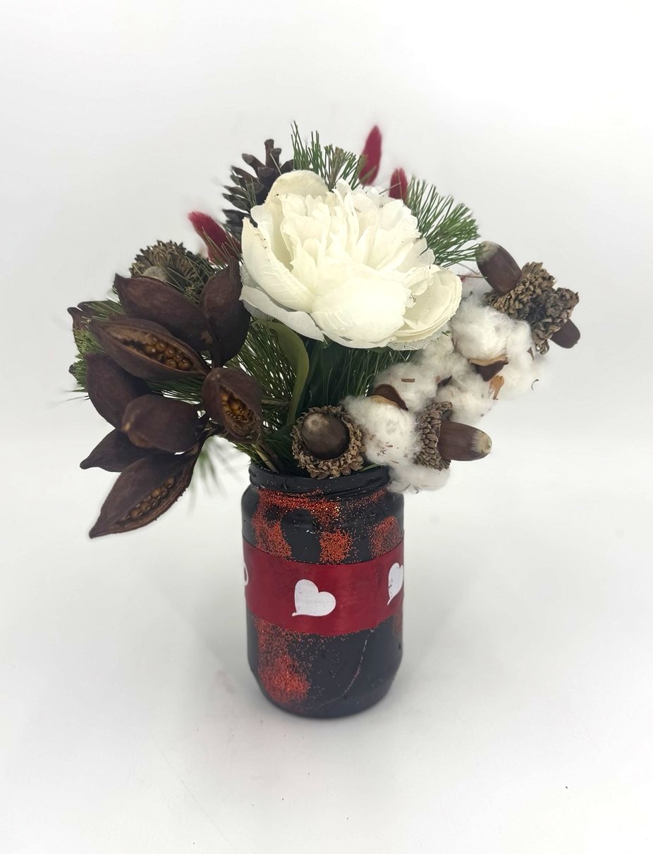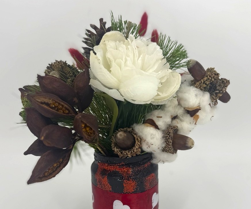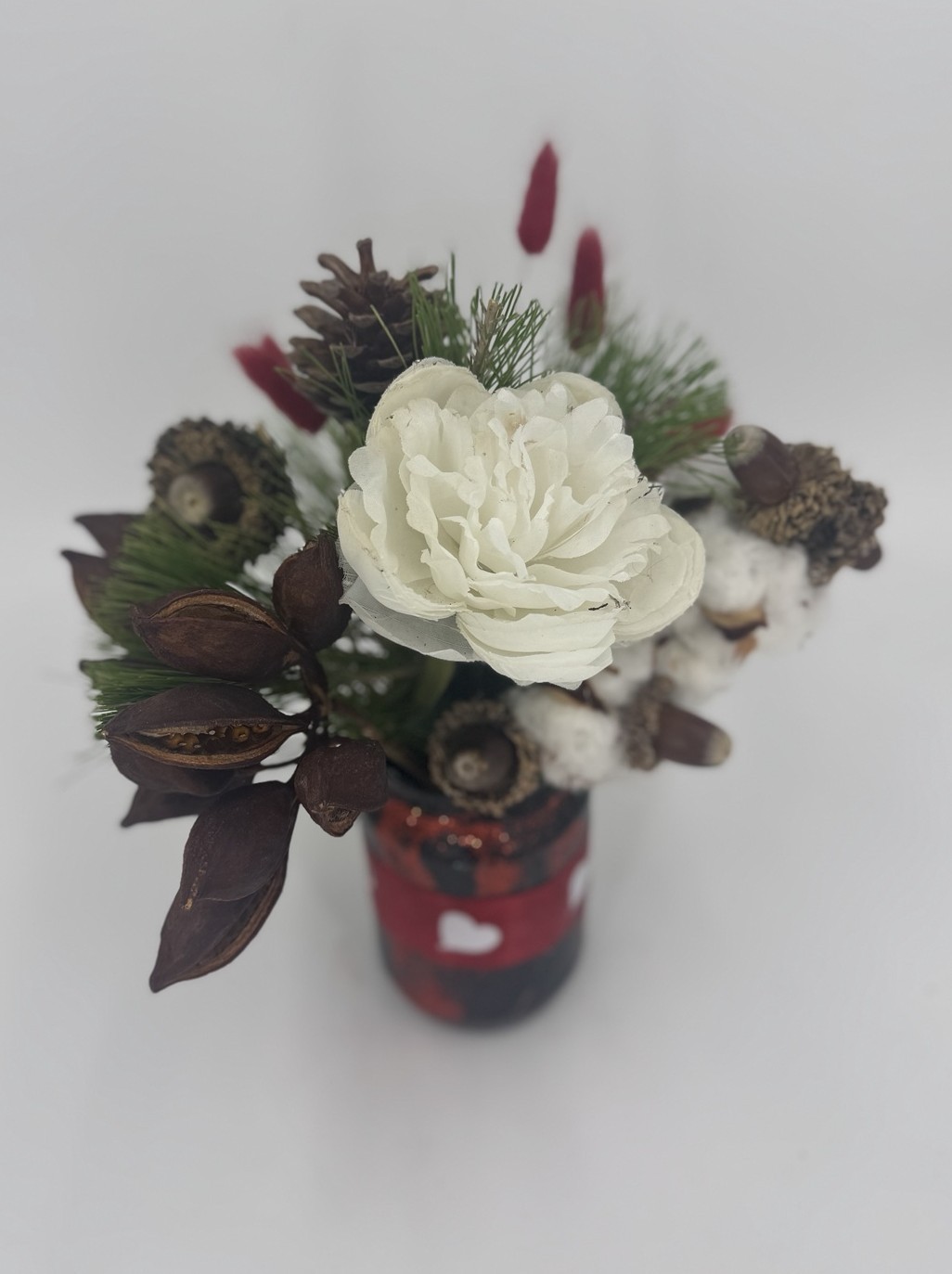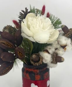 Jar με φυσικους καρπους, βελανιδια, τεχνητη παιωνια, βαμβακι, πευκο & κουκουνάρι