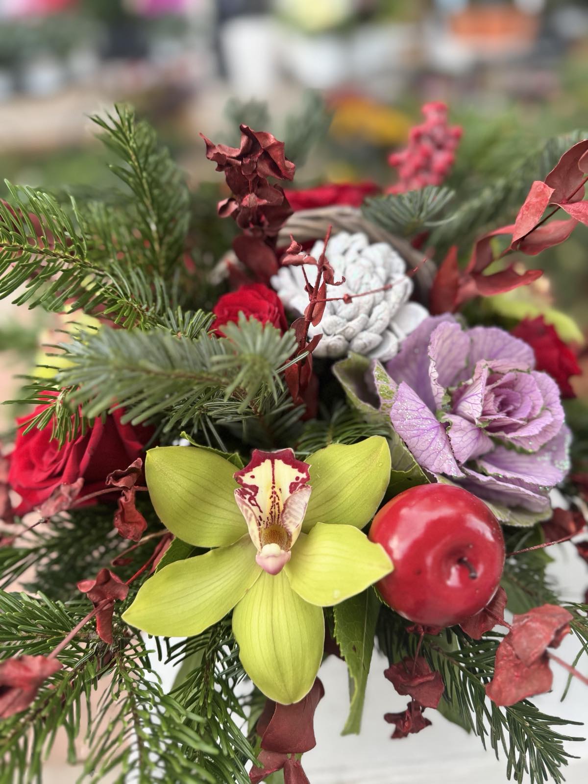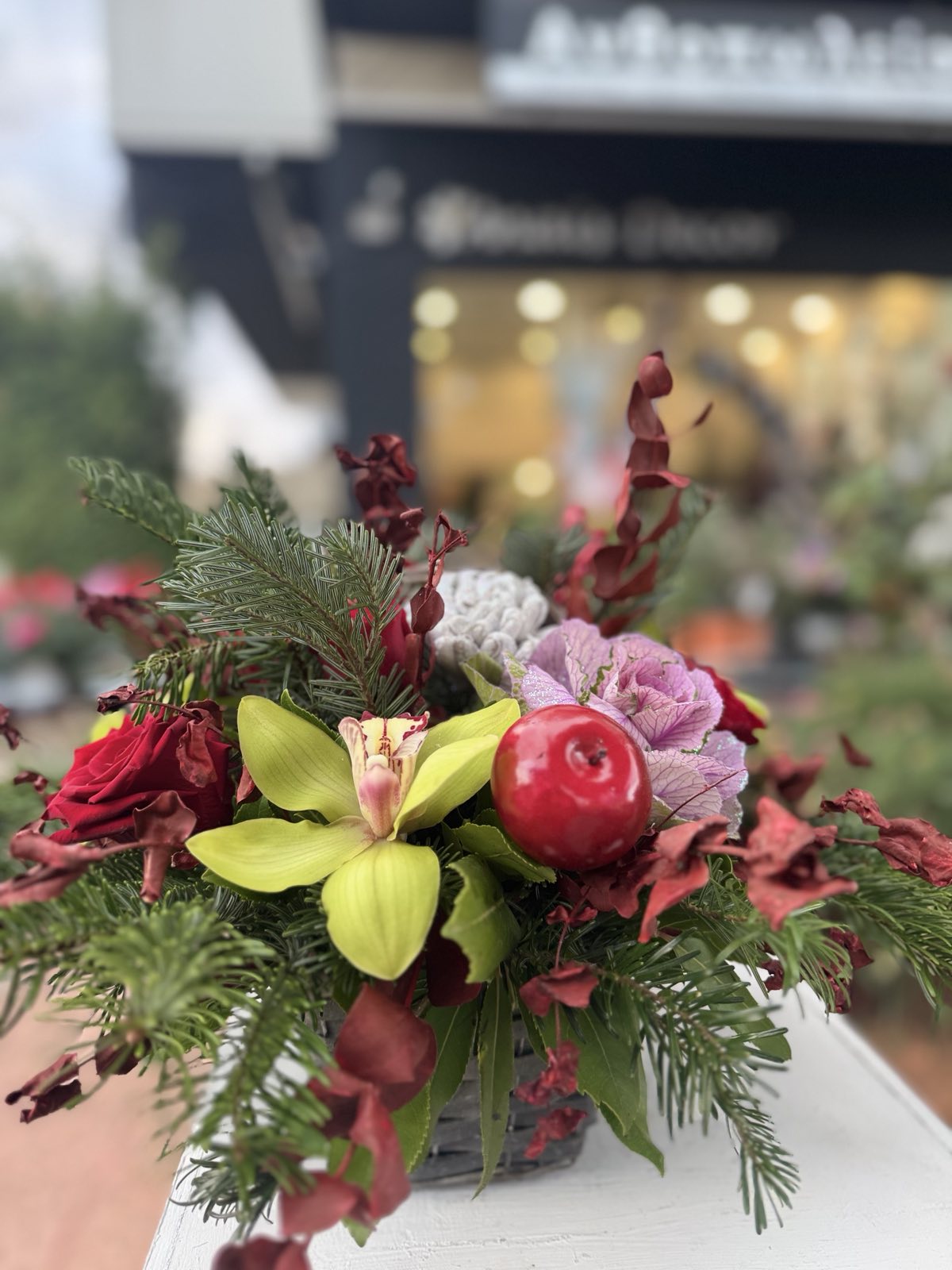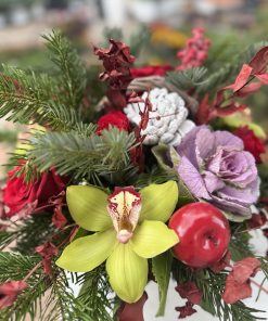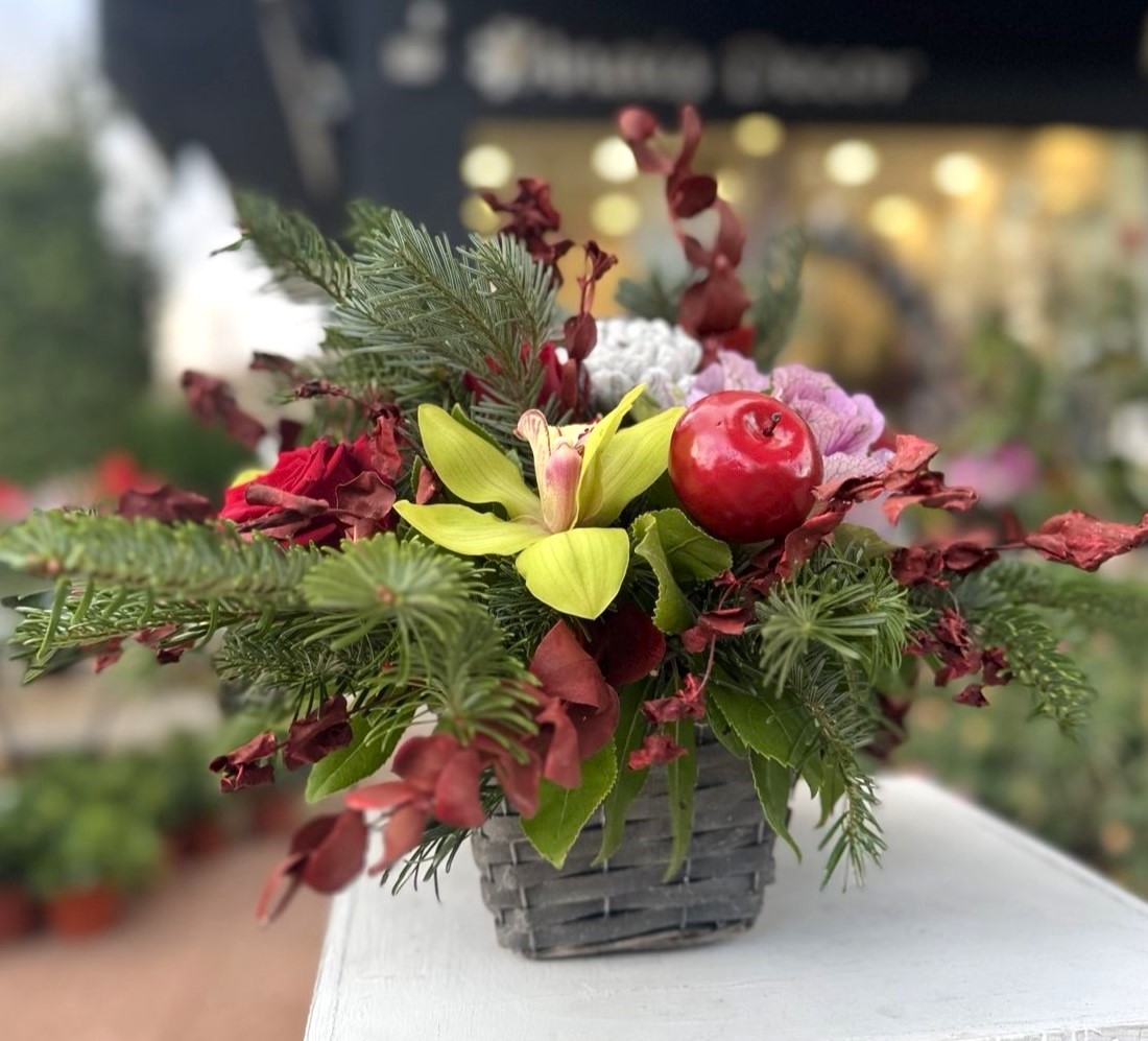Xmas Καλαθι με συνθεση με μηλα, κουκουναρια, μπράσκες, ορχιδεα σιμπιτιουμ, έλατο & μπορντό ευκαλυπτο