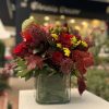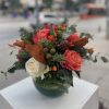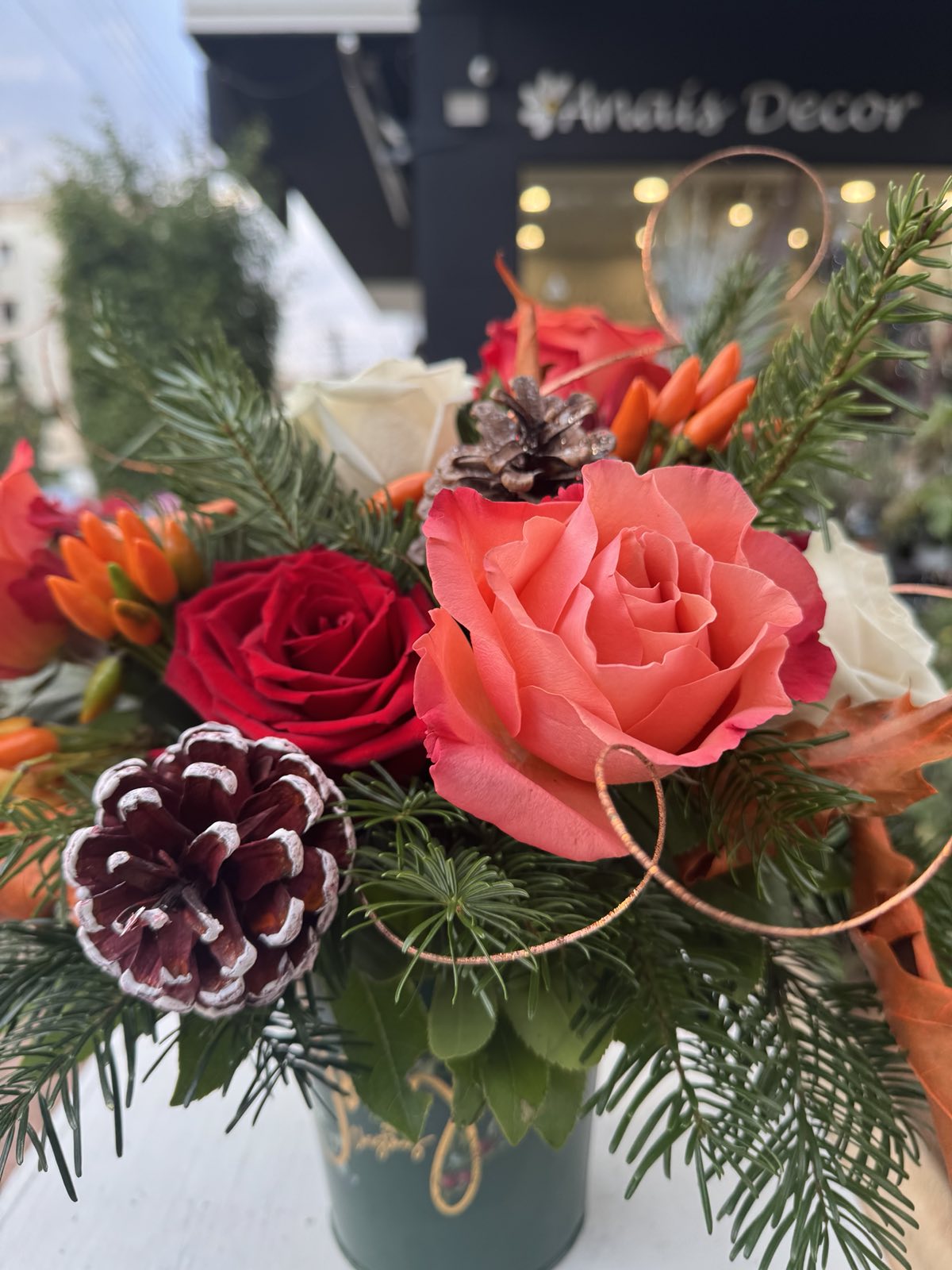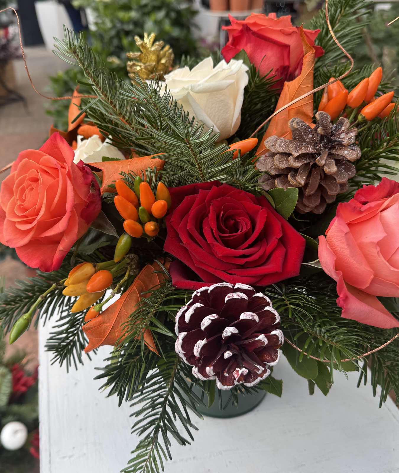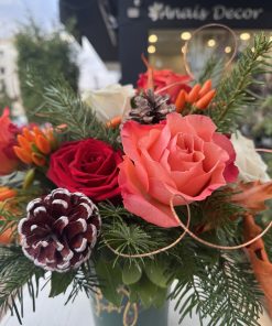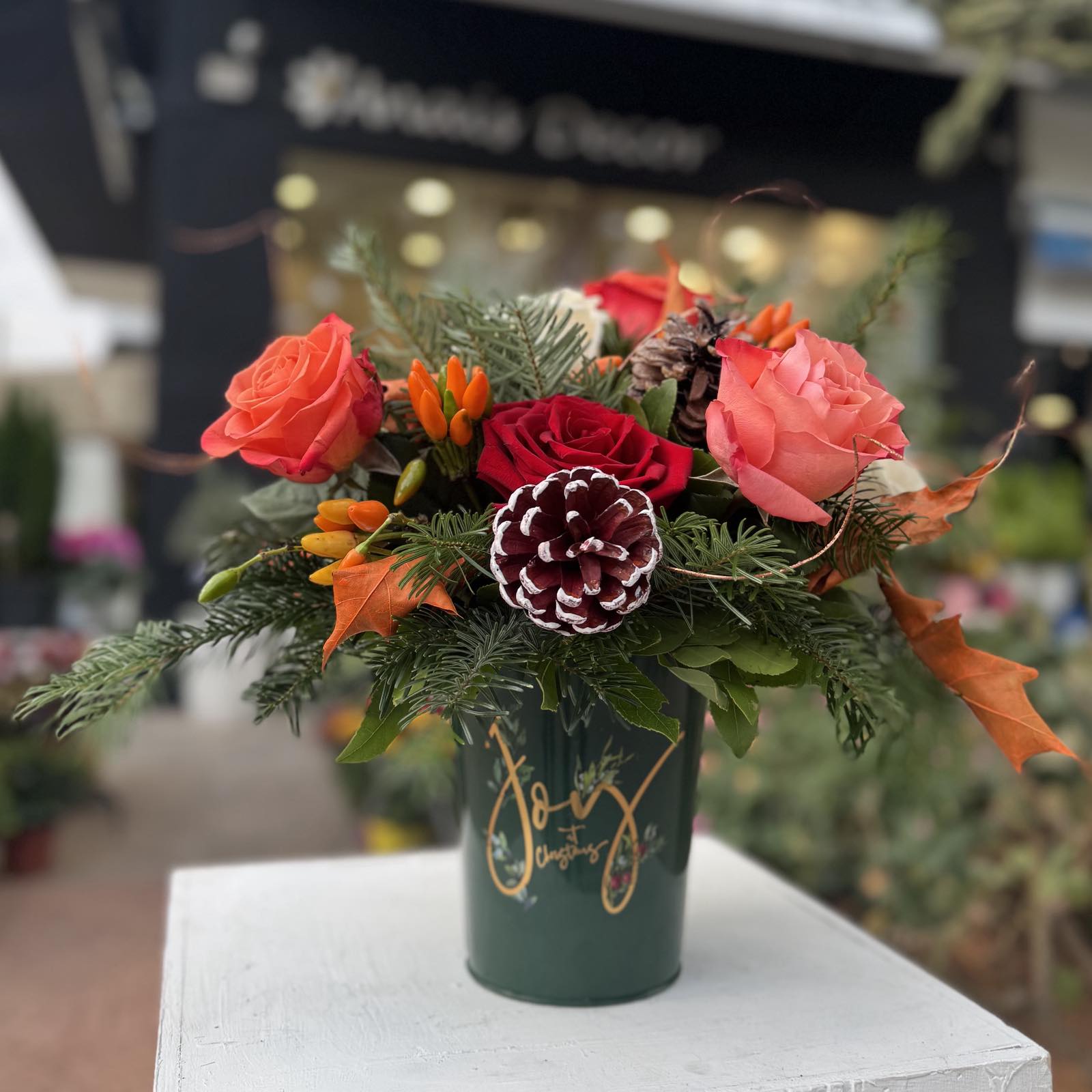 Xmas συνθεση σε Joy Pot, σε πορτοκαλί αποχρώσεις με τριανταφυλλα & χριστουγεννιάτικα διακοσμητικά